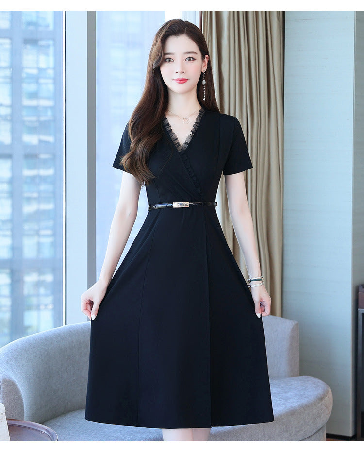 Minimalist Design Office Lady Working OL Short Sleeved Cross V-Neck Ruffle Black Waist Chiffon A-line Knee Length Dress