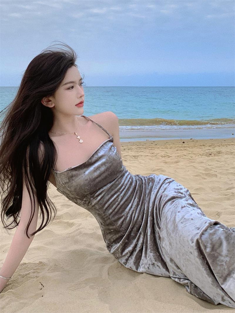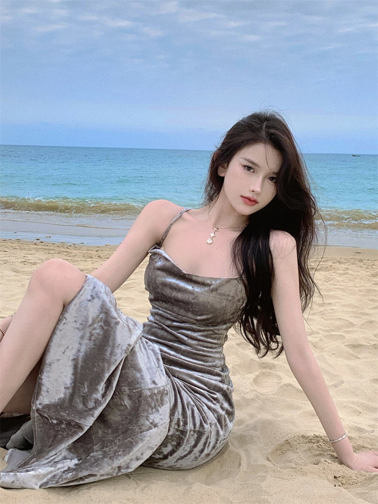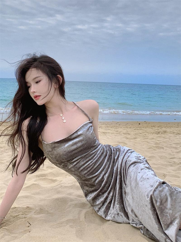 New Sexy Spaghetti Strap Hip Charcoal Grey Ruched Split Velvet Dress