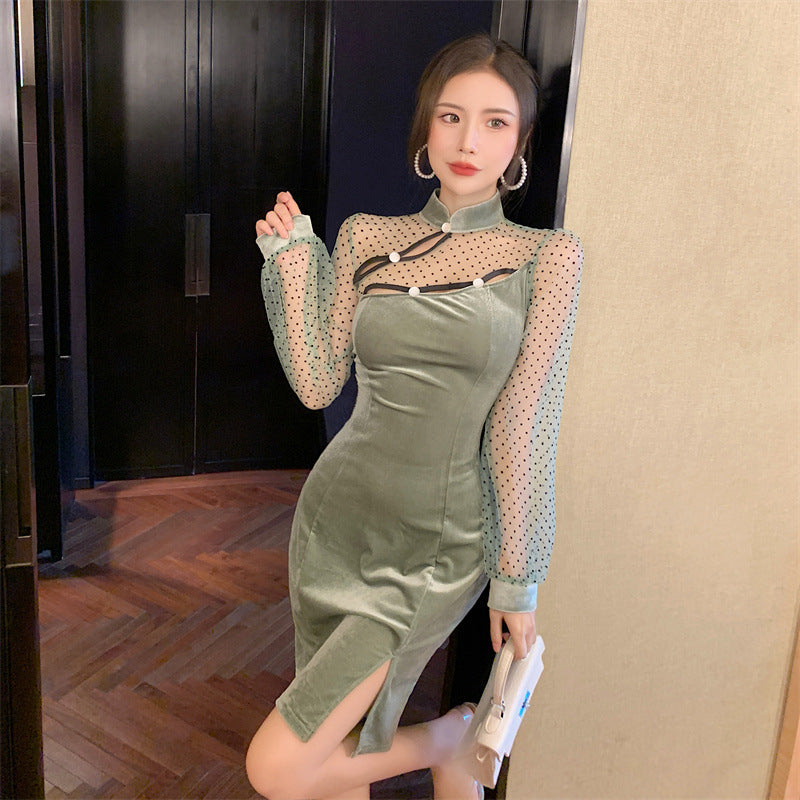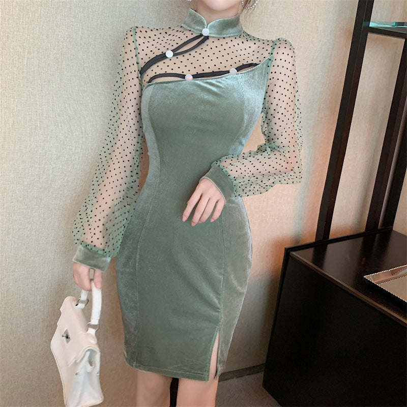 New Sexy Stand Collar Cheongsam Style Waist Hip Mesh Stitching Velvet Side Slit Mini dress