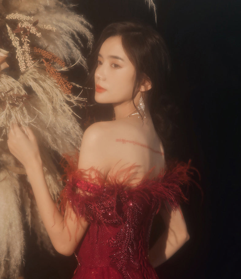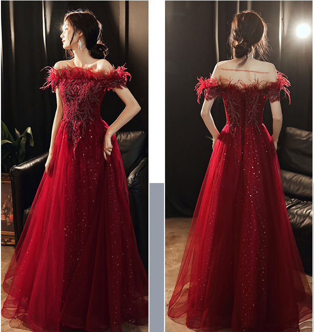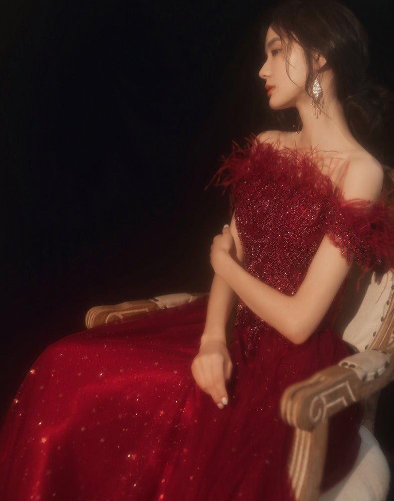 Red Bride Sleeveless Engagement Lace Up Back Feather Long Evening Party Gowns Dress