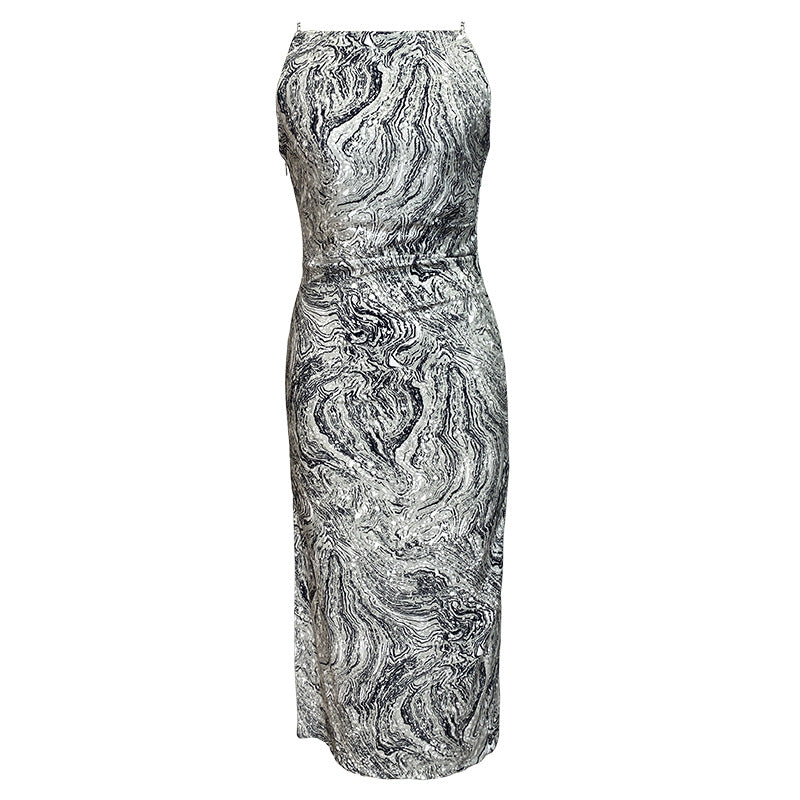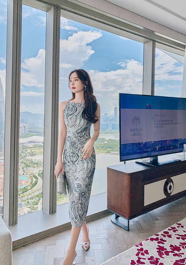 Retro Temperament Flecking Gray Shoulder Strap Printed Side Slit Pencil Dress