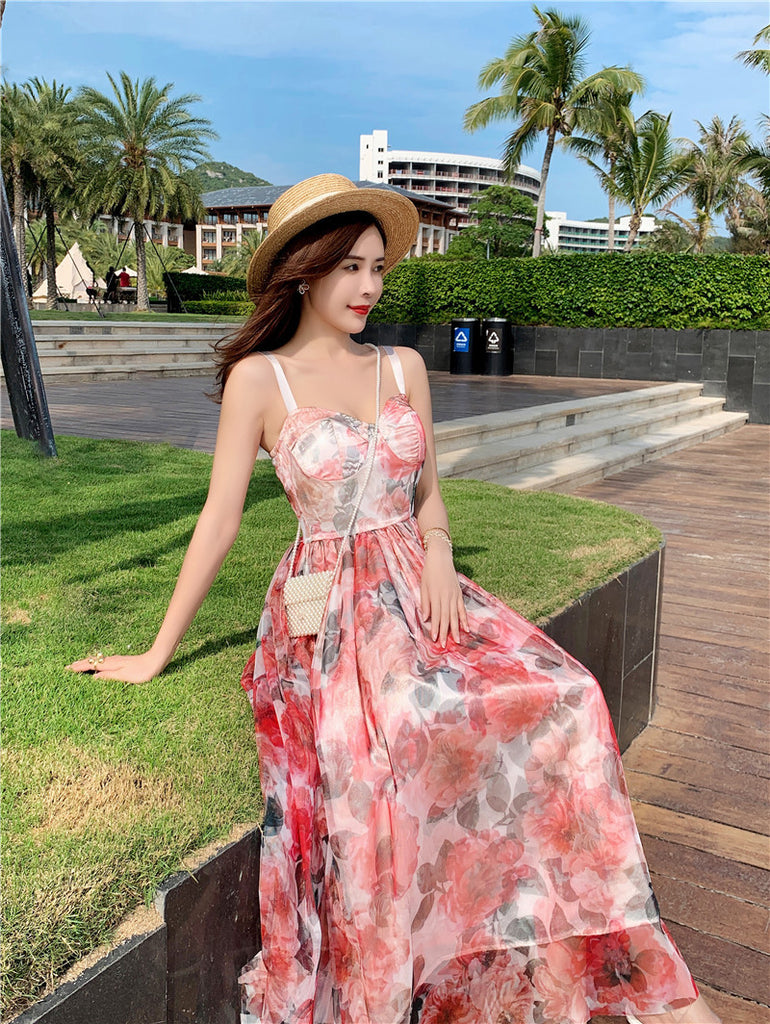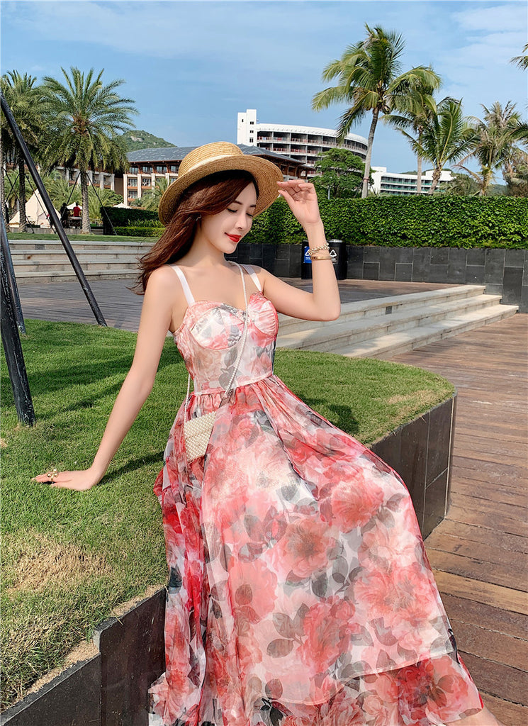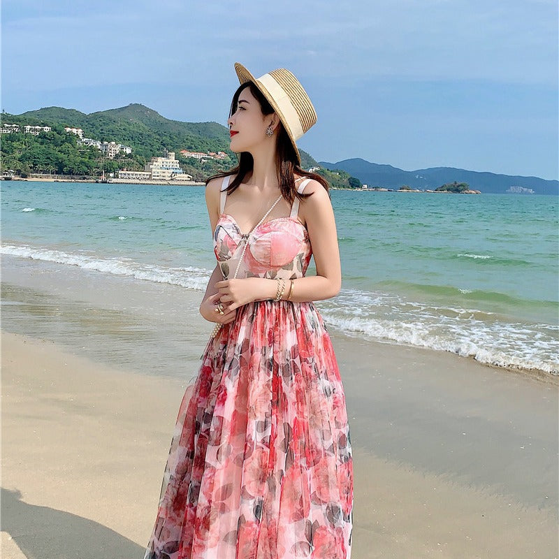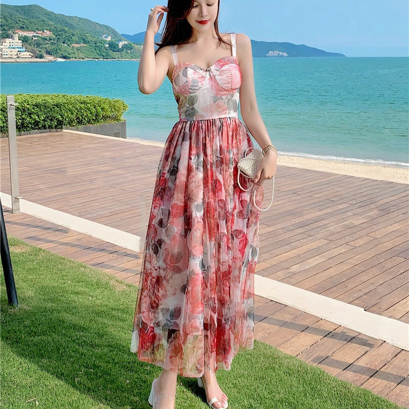 Retro Temperament Sweet Summer Women High Waist Floral Mesh Vest Dress