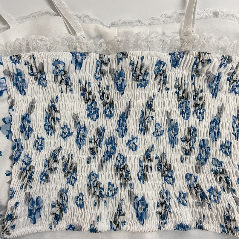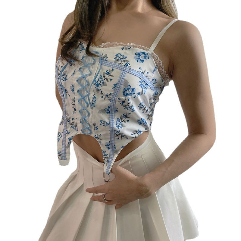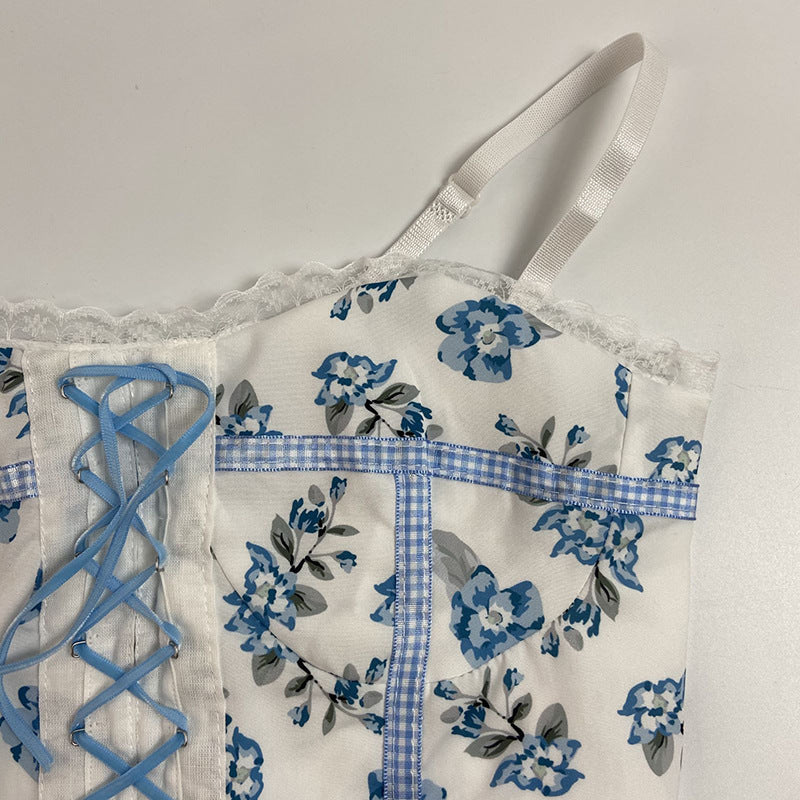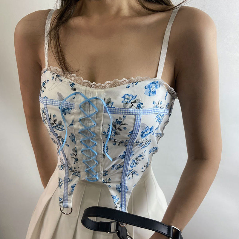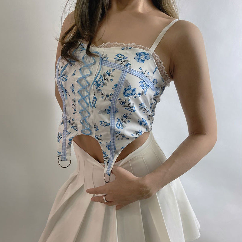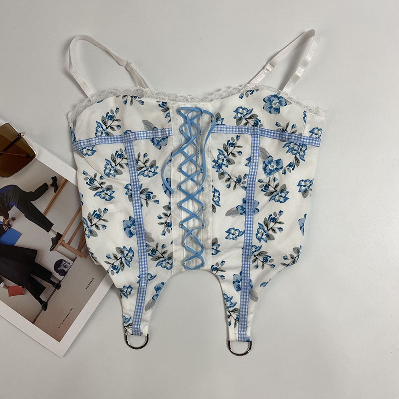 Sexy Chic Women Lace up Blue Floral Print Spaghetti Strap Tight Vest Cropped Corset Top