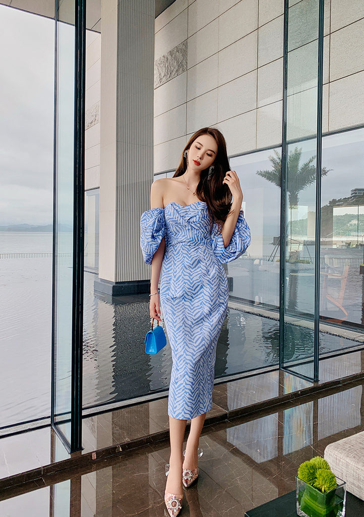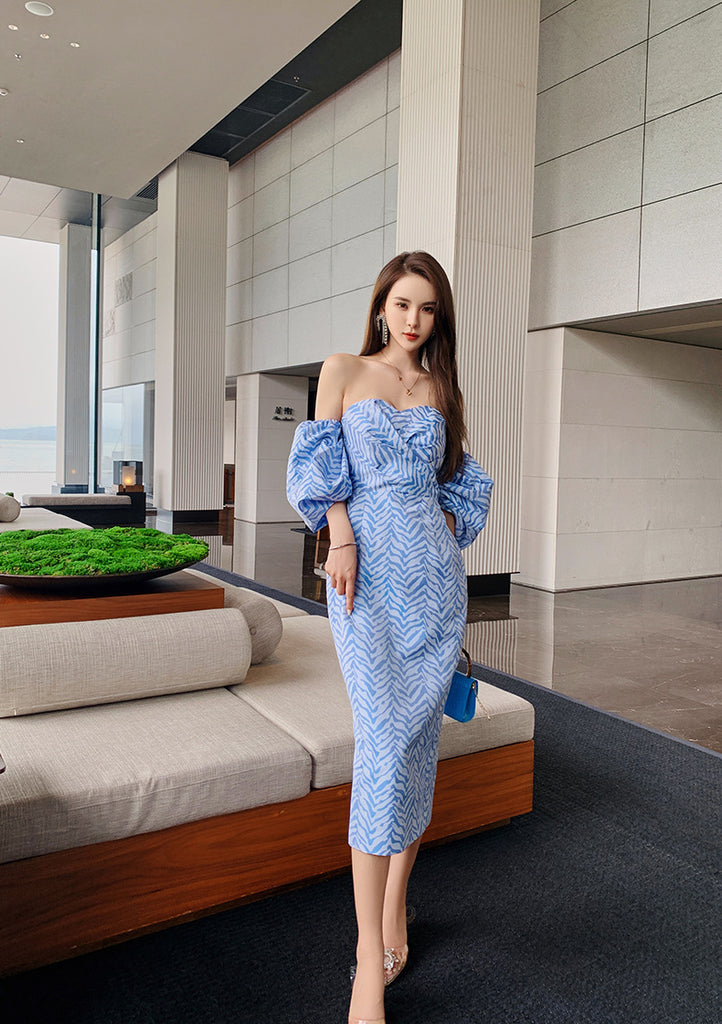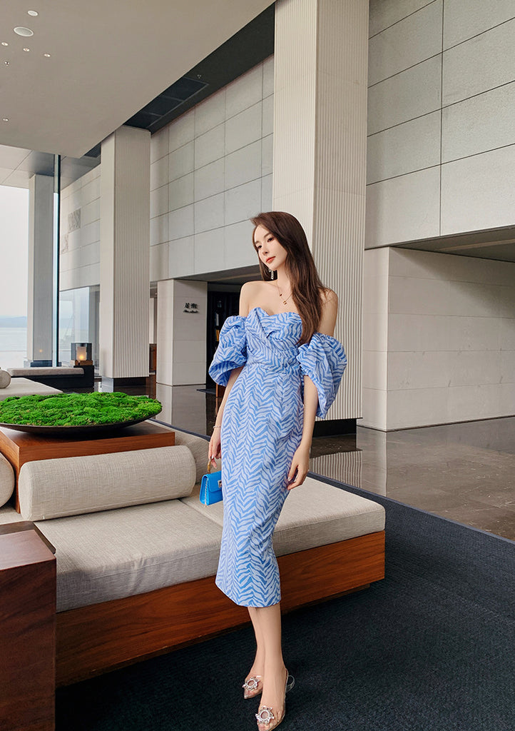 Sexy Women Tube Top Off Shoulder Blue Striped Backless Puff Sleeve Wrap Bust Ruffled Dress