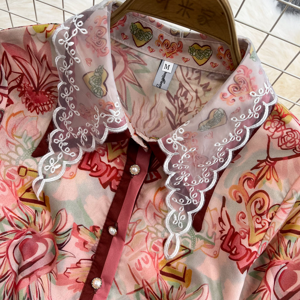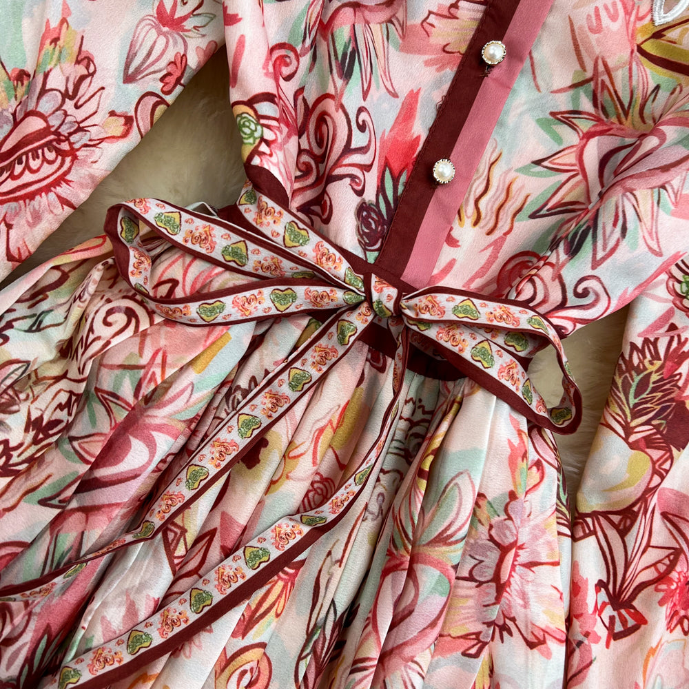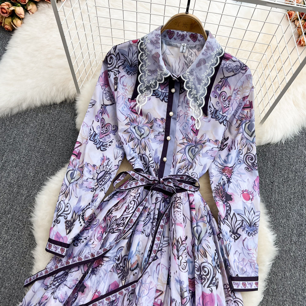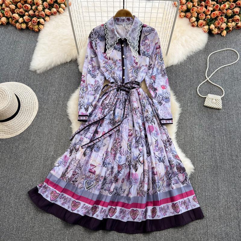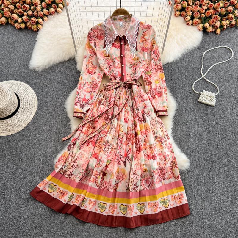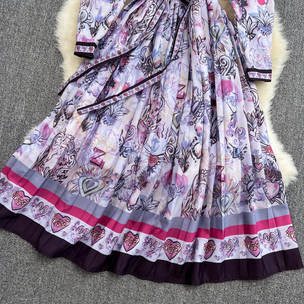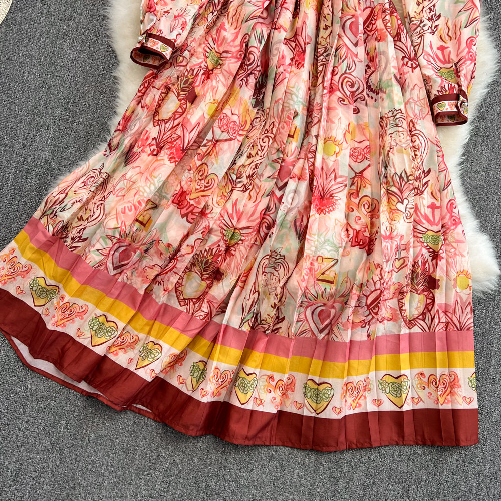 Spring Great Look Temperament Elegant Women Polo Neck Long Sleeves A Line Graphic Pattern Pleated Dress