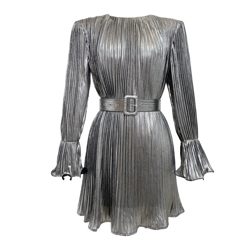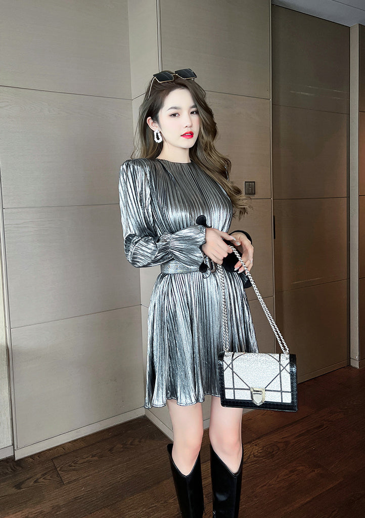 Spring Temperament Women Long Sleeves Cyber Shiny Silver Pleated Ruffled High Waist Dress