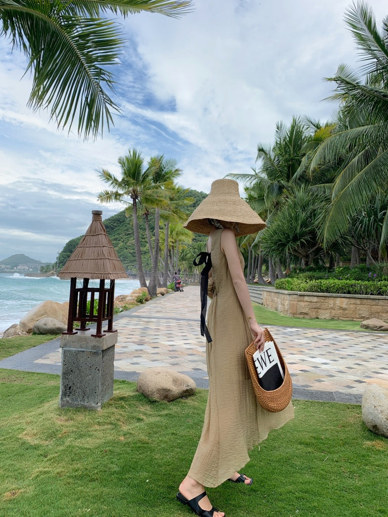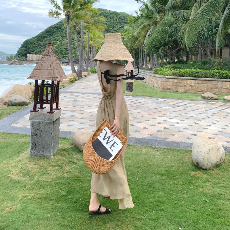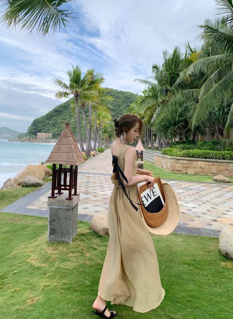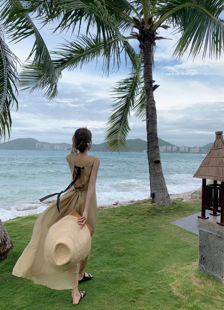 Stylish Temperament Back Bow Tie Holiday Beach High Backless Sleeveless Banquet Party Light Brown Long Dress