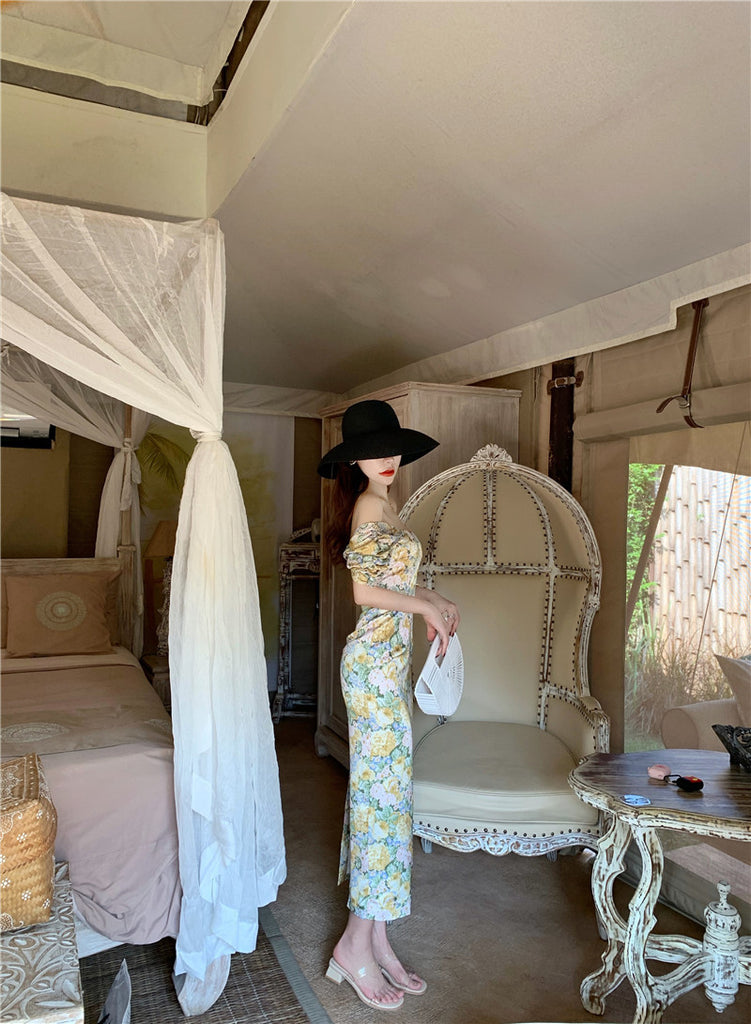 Summer Temperament Women Retro Strapless Yellow Floral Mid Length Puff Sleeves High Waist Holiday Long Dress
