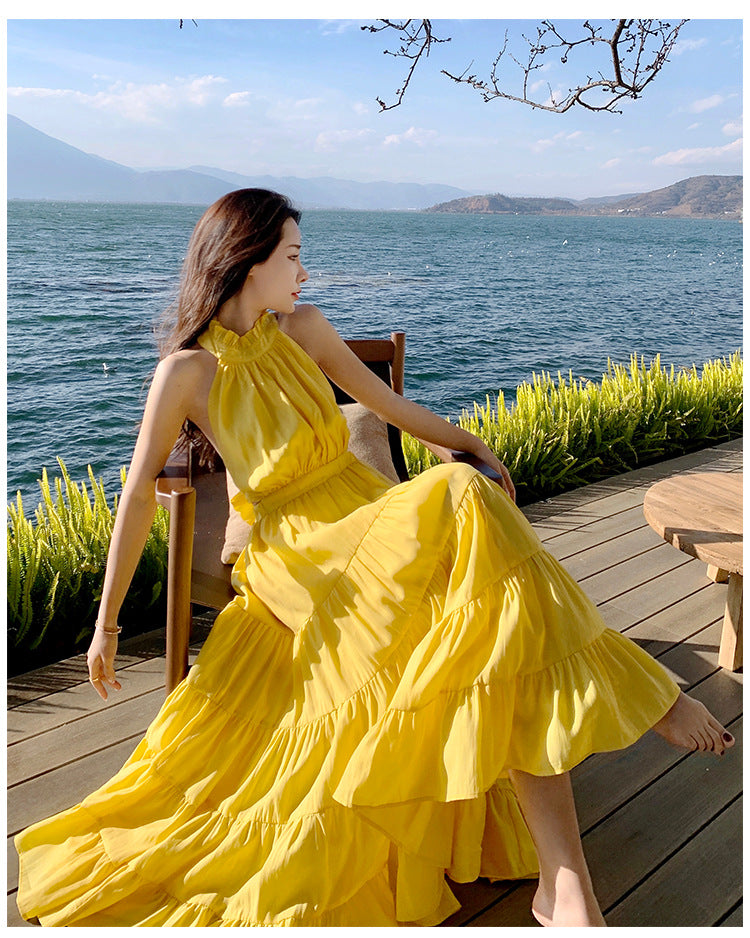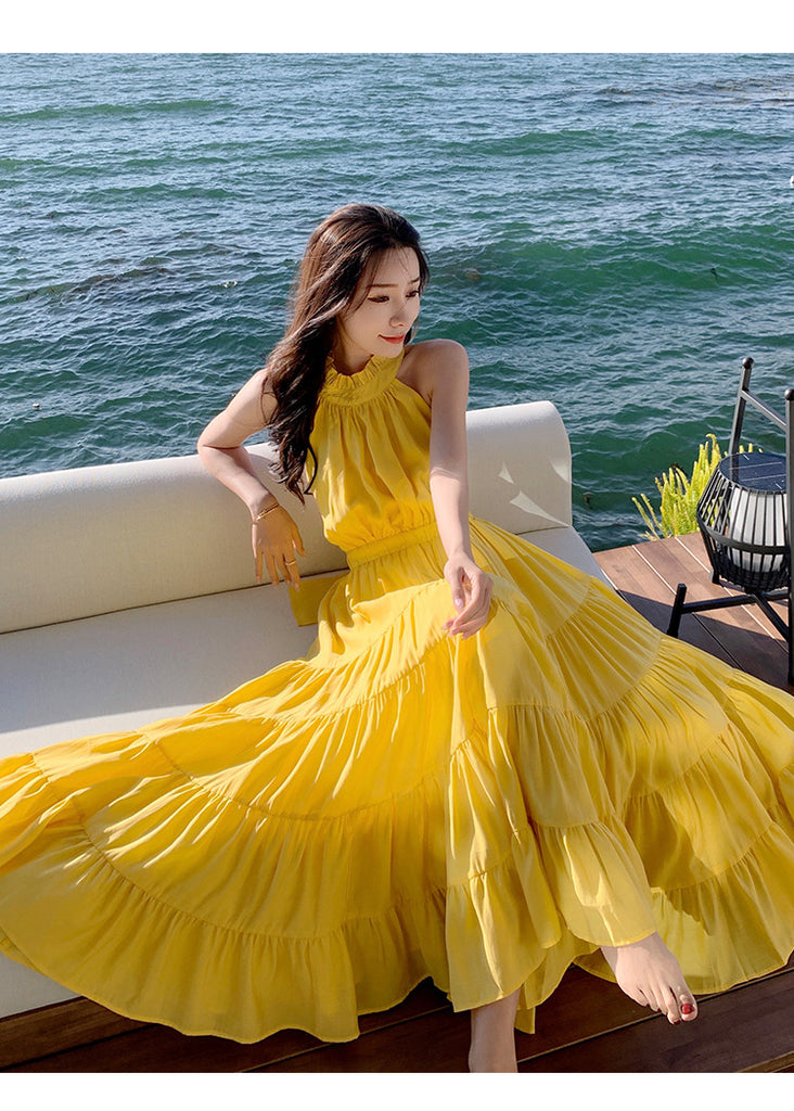 Summer Women Seaside Halter Neck Backless Bow Big Swing Cake Long Skirt Dress