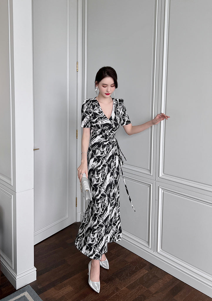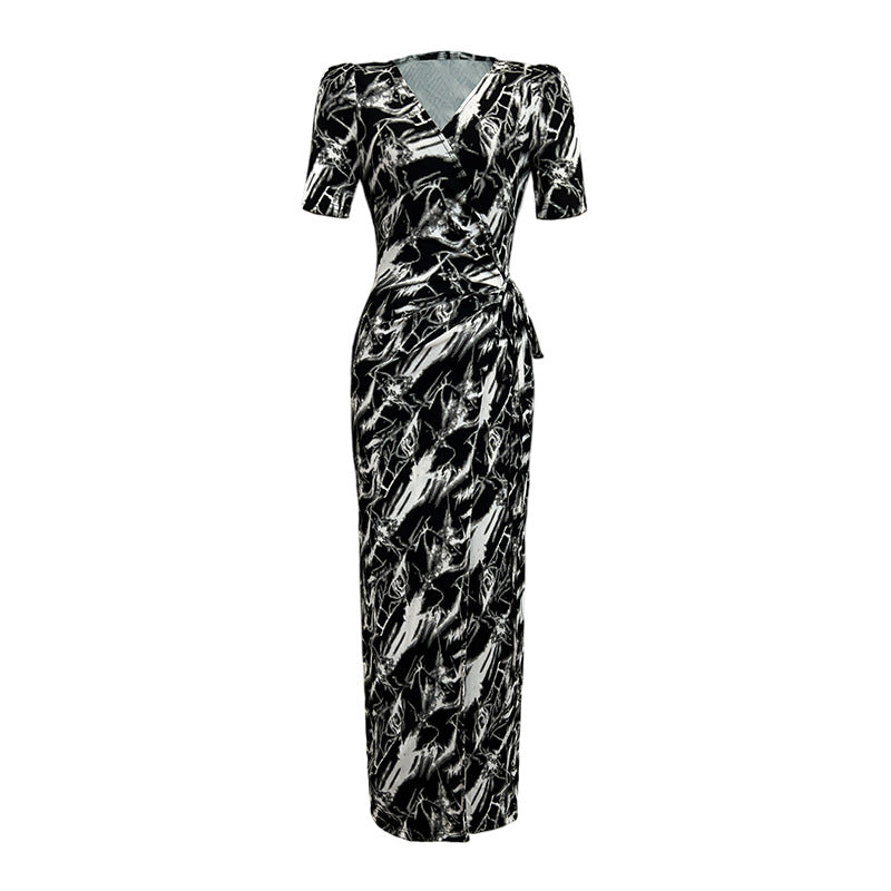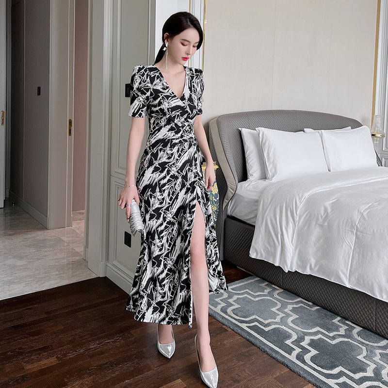 Summer Women Temperament Short Sleeves VNeck Wrap Side Slit Long Dress
