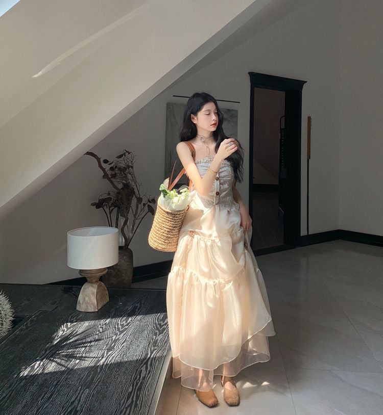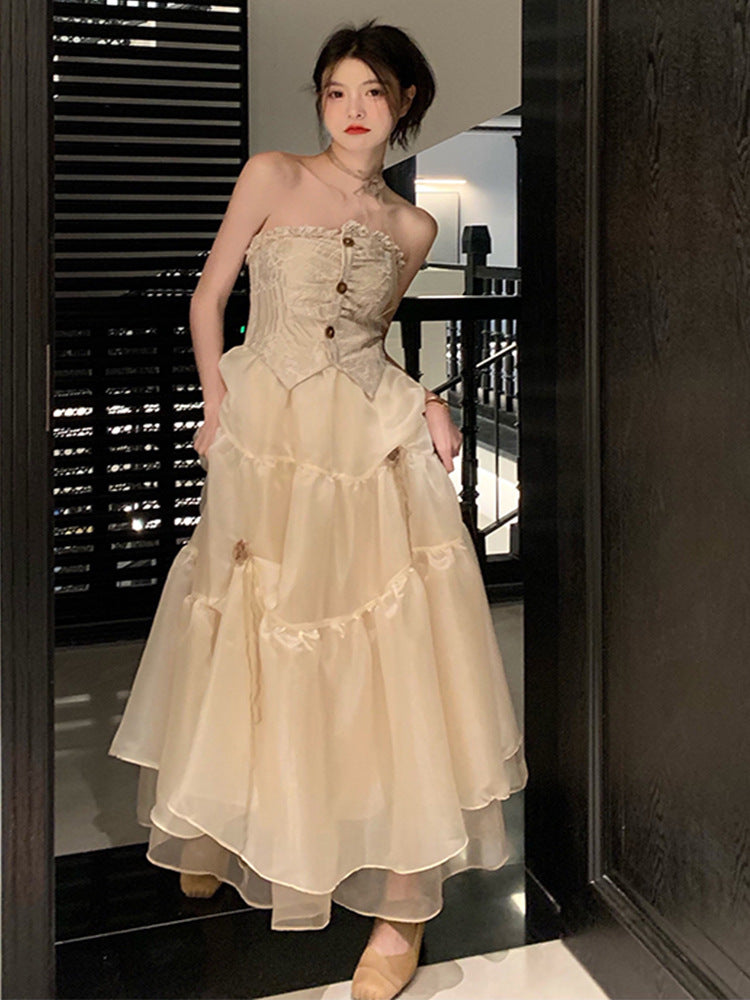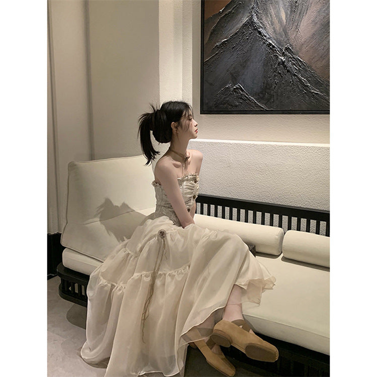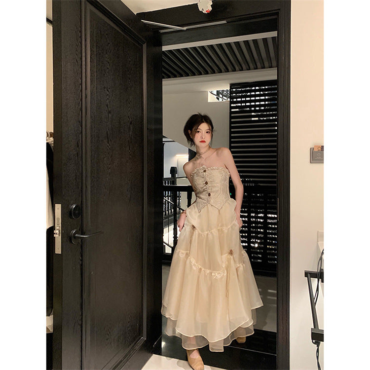 Temperament Summer Women Retro Vintage Sleeveless Tube Top High Waist Mesh Gauze Stitching Big Swing Cake Dress