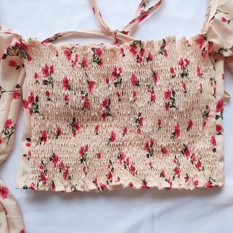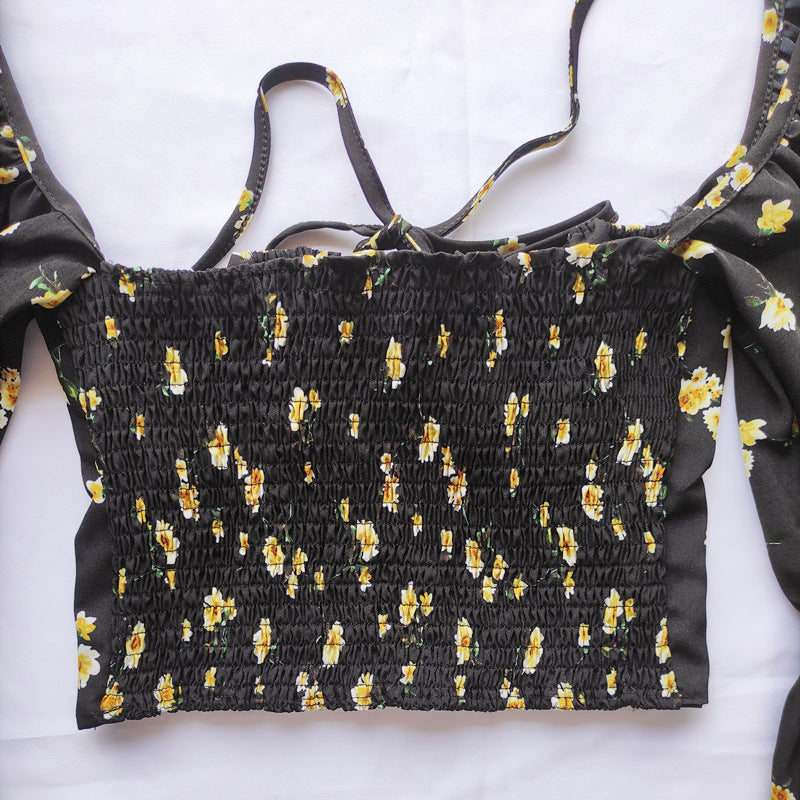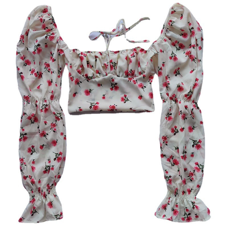 Pattern: Floral Printed, Square Collar, Puff Long Sleeves, Crop Top