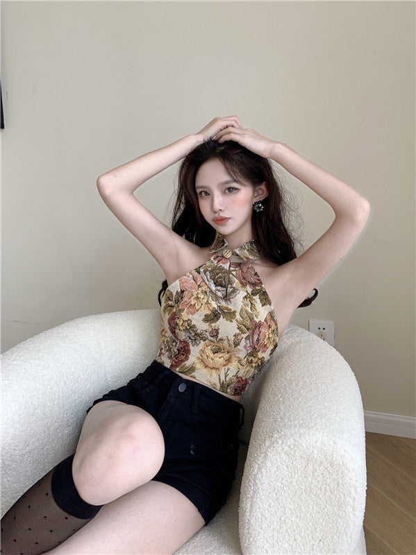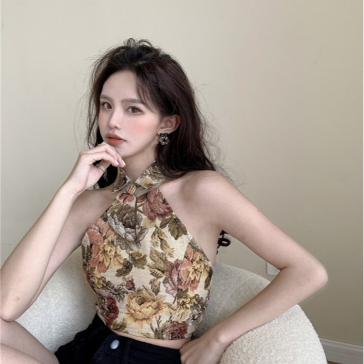 Amazing Trendy Women Floral Printed Halter Collar Neck Crop Vest Fit Slim Design Top