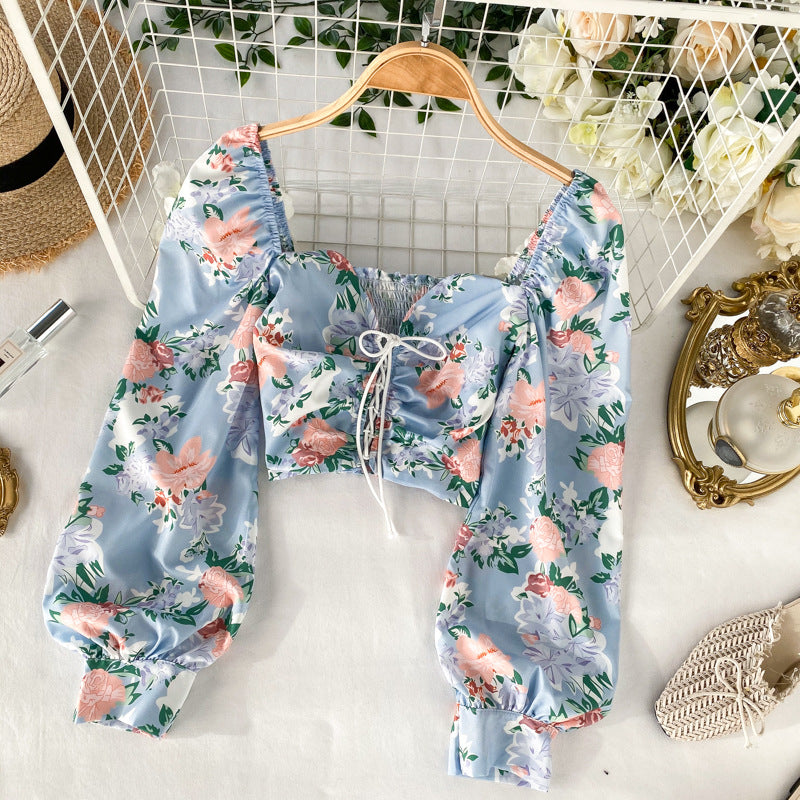 Cute Women Blue Square Neck Elastic Floral Printed Puff Long Sleeves Front Drawstring Crop Top Blouse