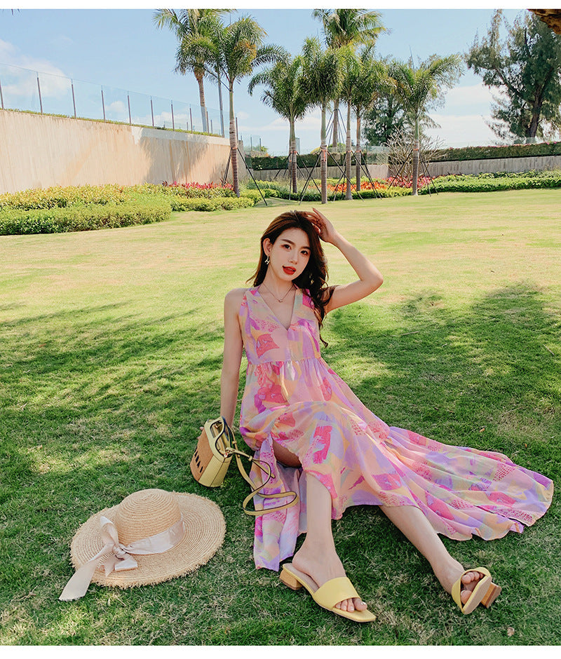 Elegant Summer Beach Sexy Women V-neck Backless Floral Printed Side Split Leisure Long Maxi Dress