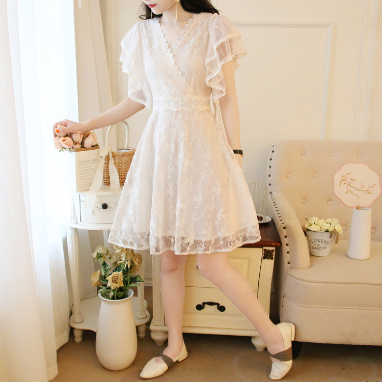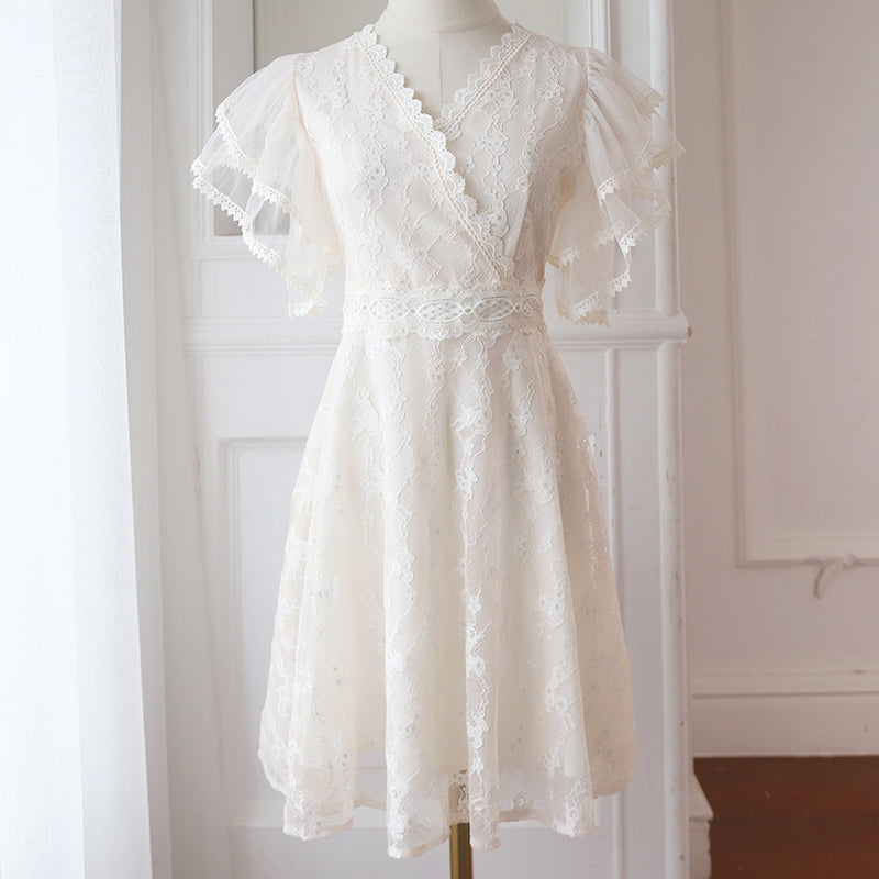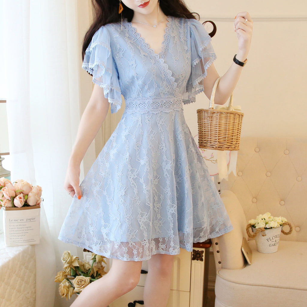 Fairy Temperament V-neck Double-layer Lotus Leaf Sleeves super Sweet Lace Skirt