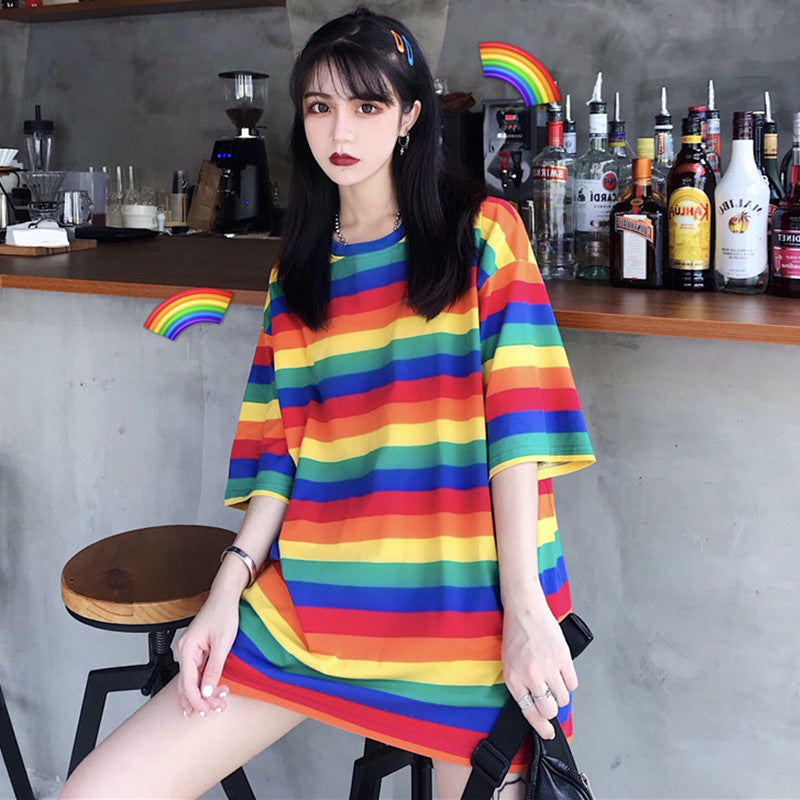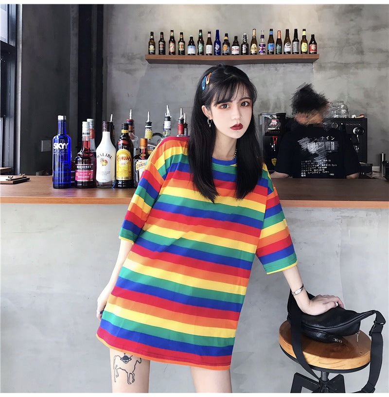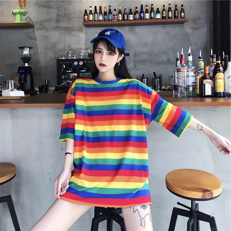 Hot Trendy Women Mid Length Rainbow Striped Loose Short Sleeved T-shirt Top Shirt