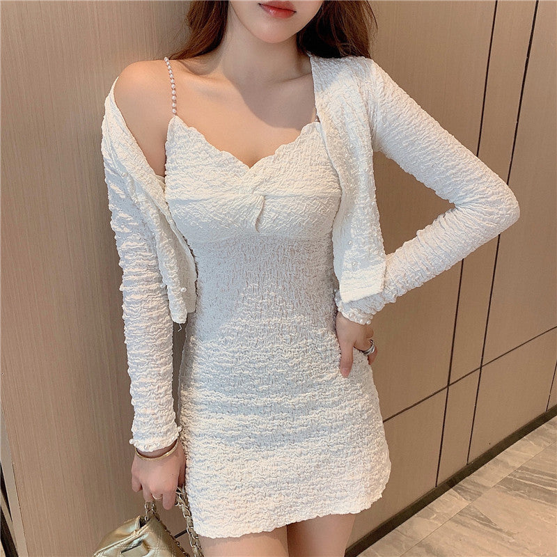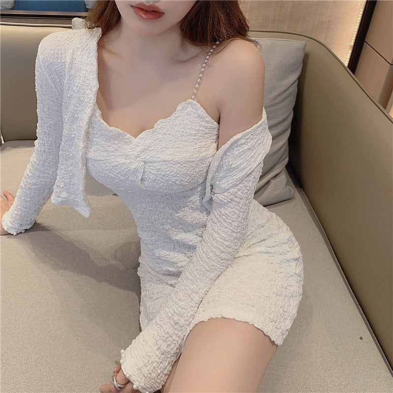 Large Size Sexy Women V-neck Pearl Sling Strap Skirt Coat Cardigan Top Jacket