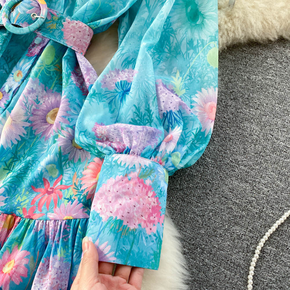 New Artsy Style Stylish Women Stand Collar Long Lantern Sleeve Floral printed Mid Length Pleated Dress