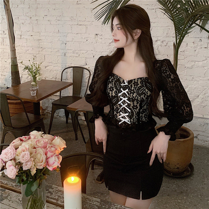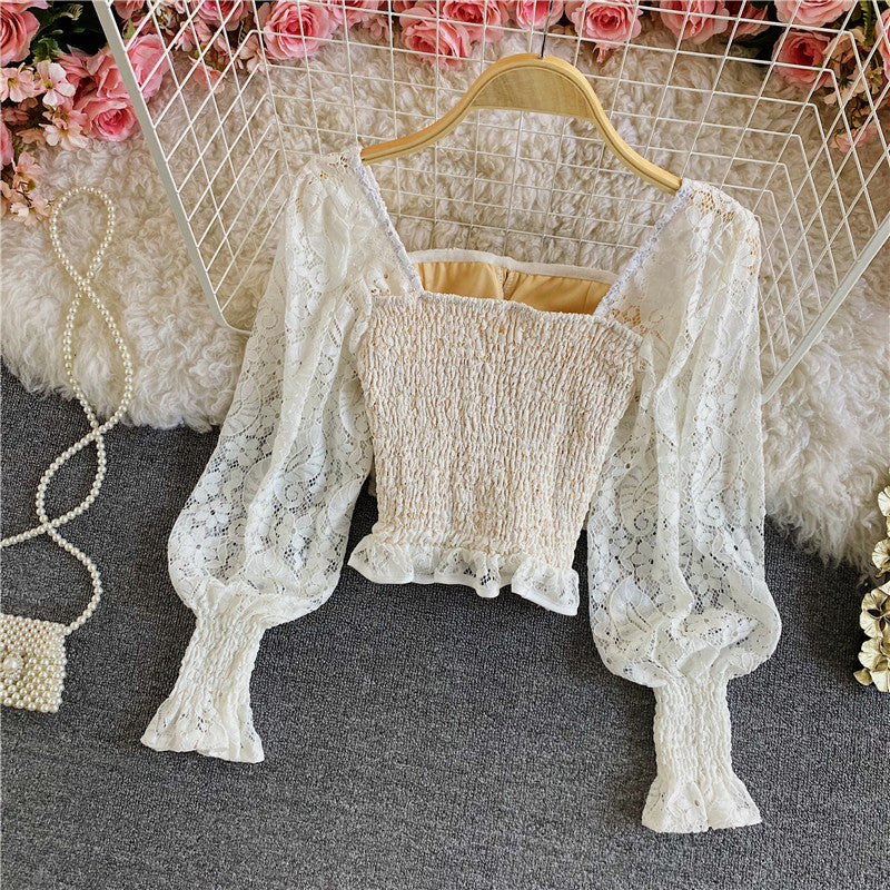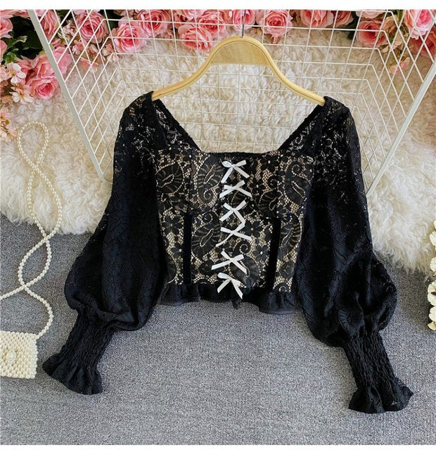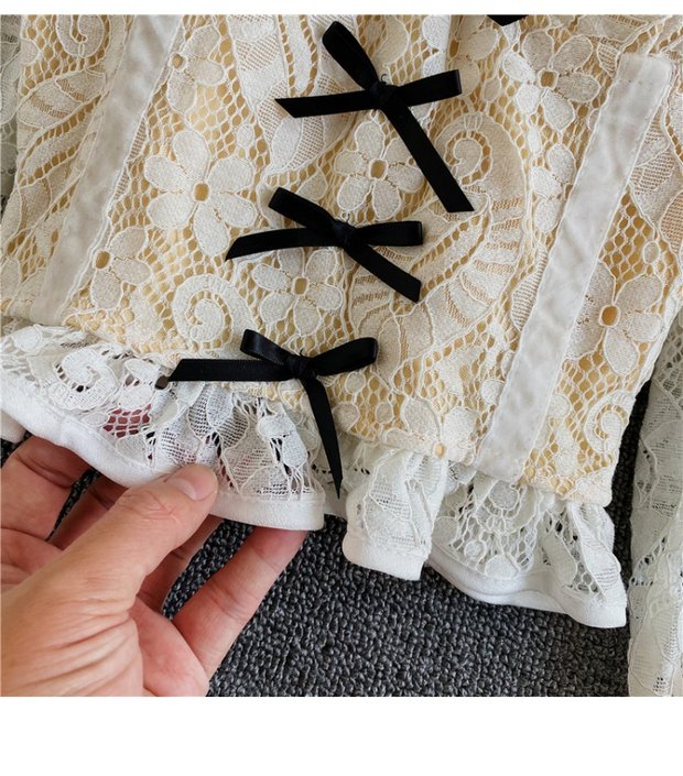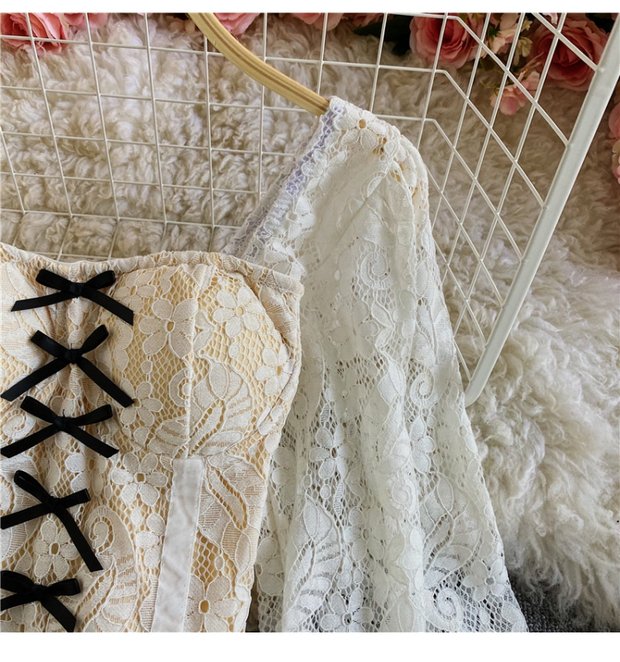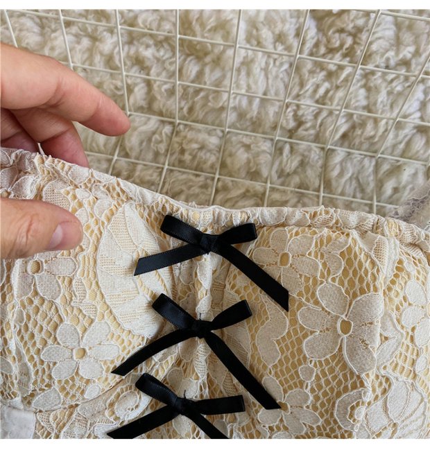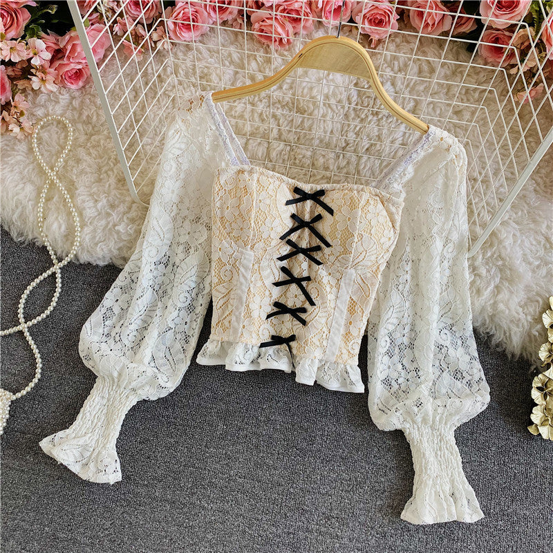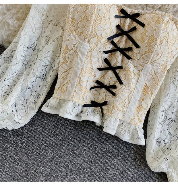 Palace Style Temperament Women Lotus Leaf Waist Lace Square Collar Sweet Bowknot Puff Sleeve Crop Bustier Top Blouse
