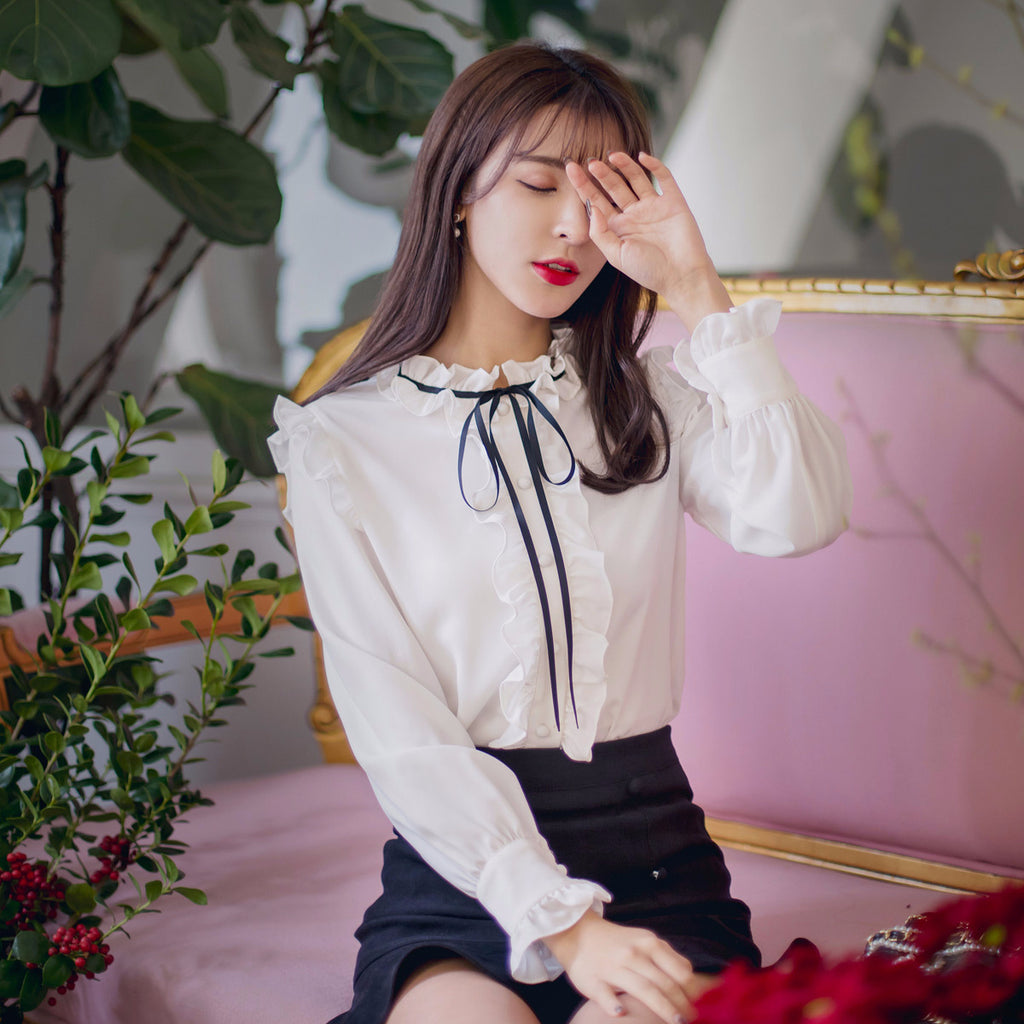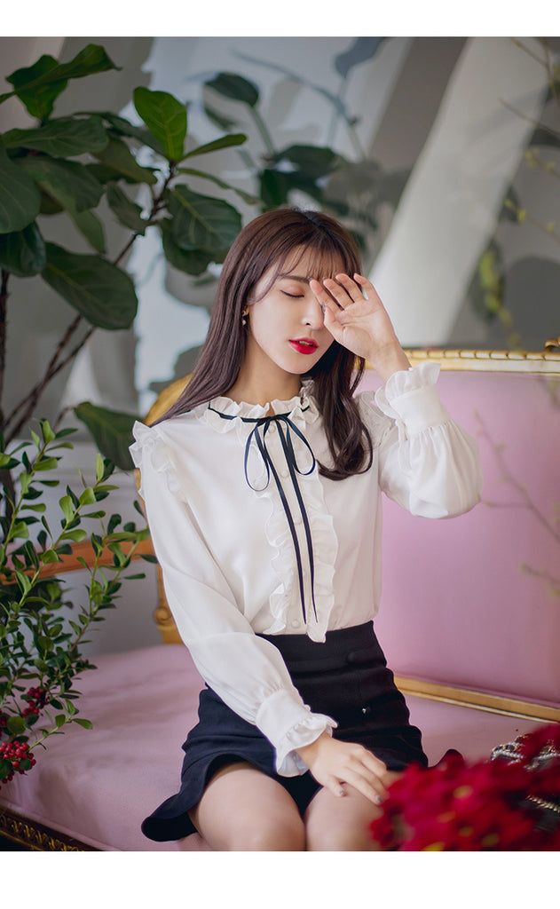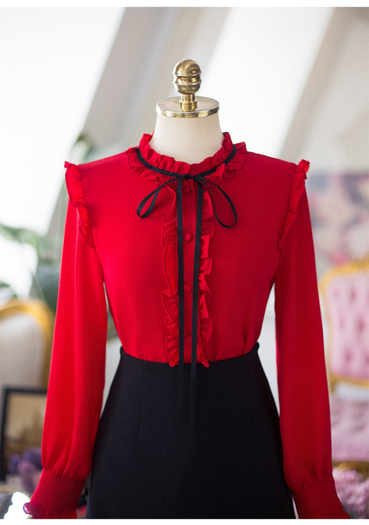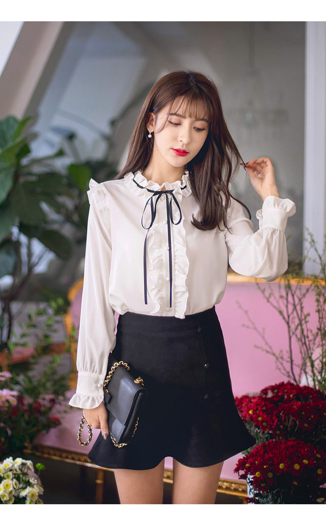 Perfect Look Solid Ruffle Front Button Frill Trim Mock Neck Stand Collar Design Top Long Sleeved Chiffon Shirt Blouse