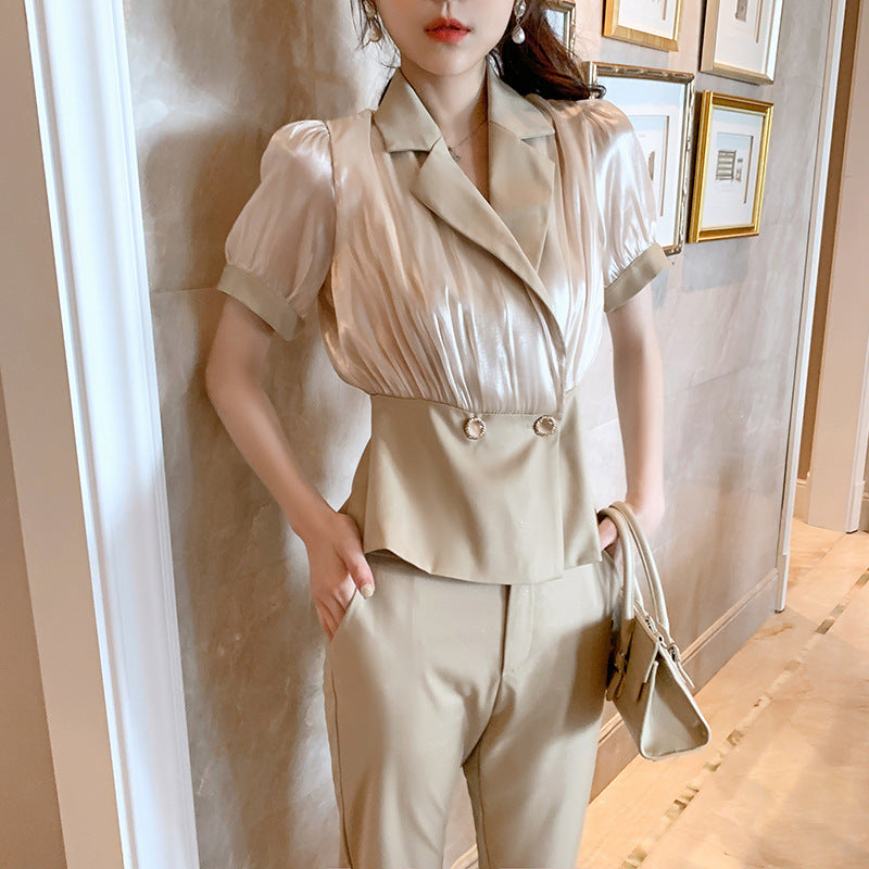 Professional Temperament Elegant Office Ladies Sheer Streetwear Top V Neck Collar Short Sleeves Long Trousers Pants Two Piece Suit