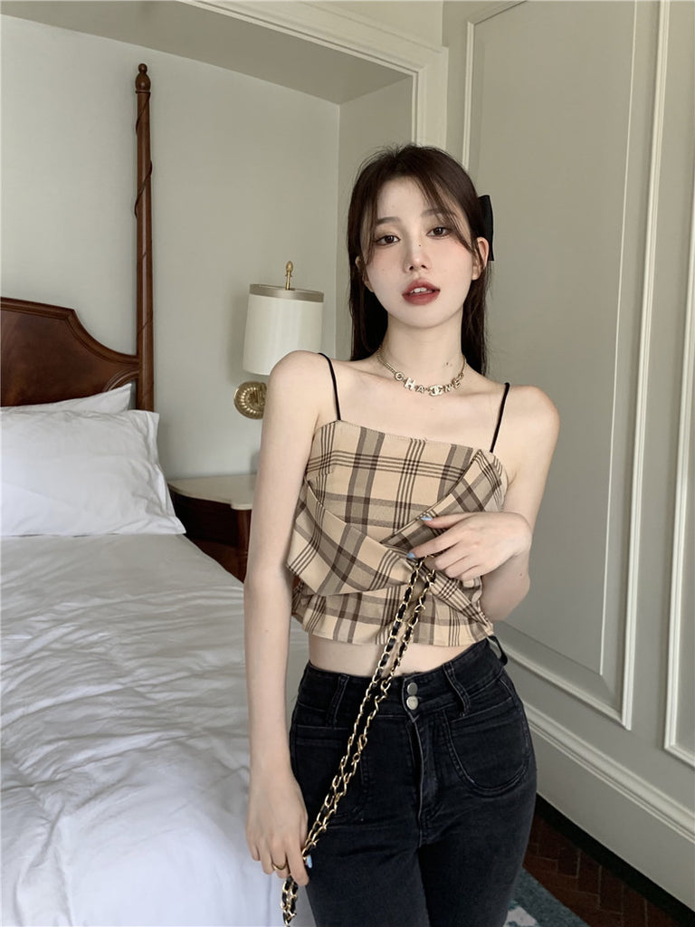 Retro Plaid Tops Summer Design Pretty Women Fit Waist Camisole pleated Vest Tube Top
