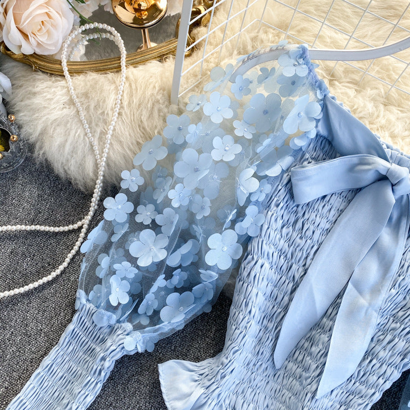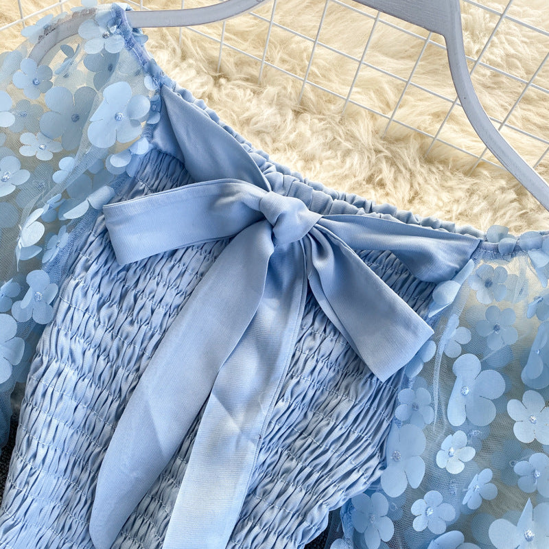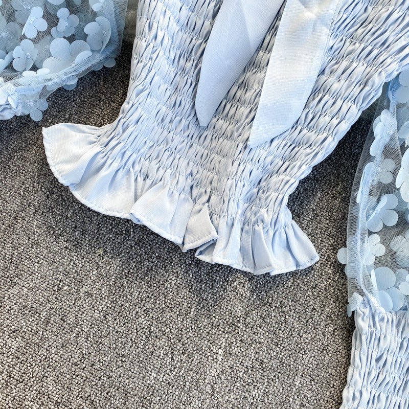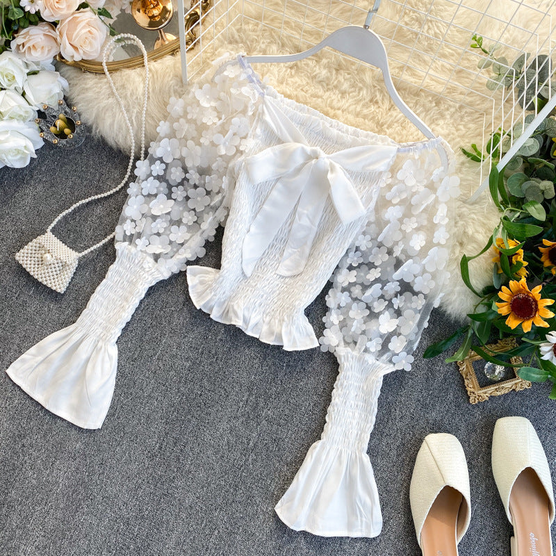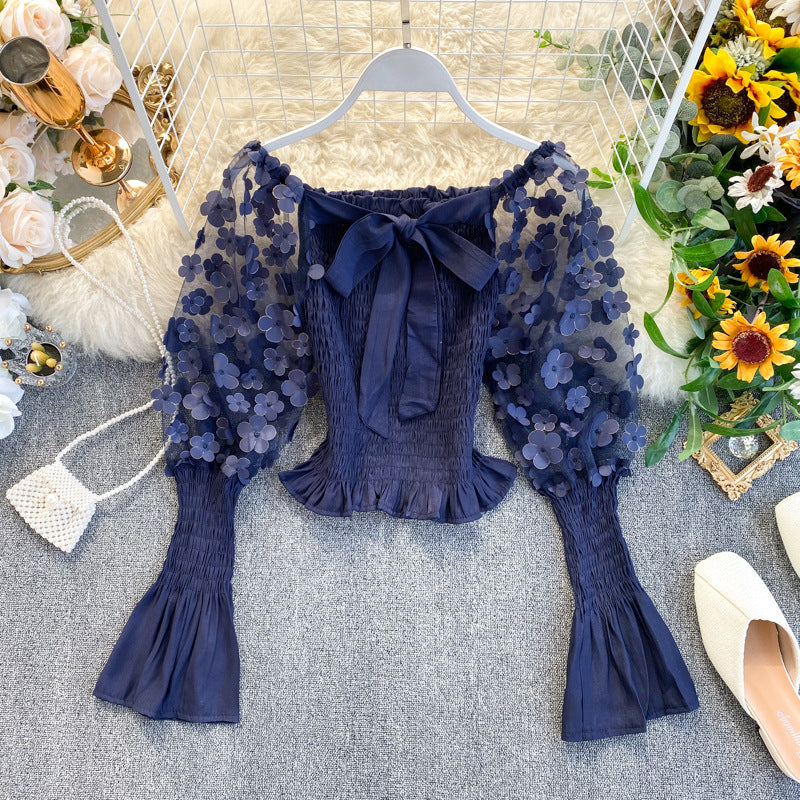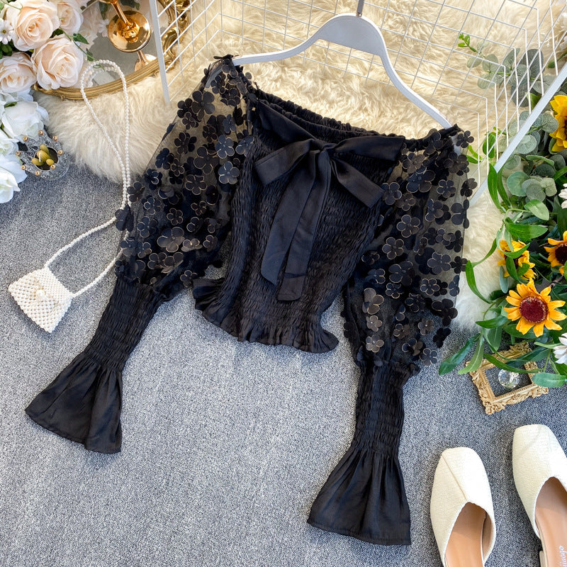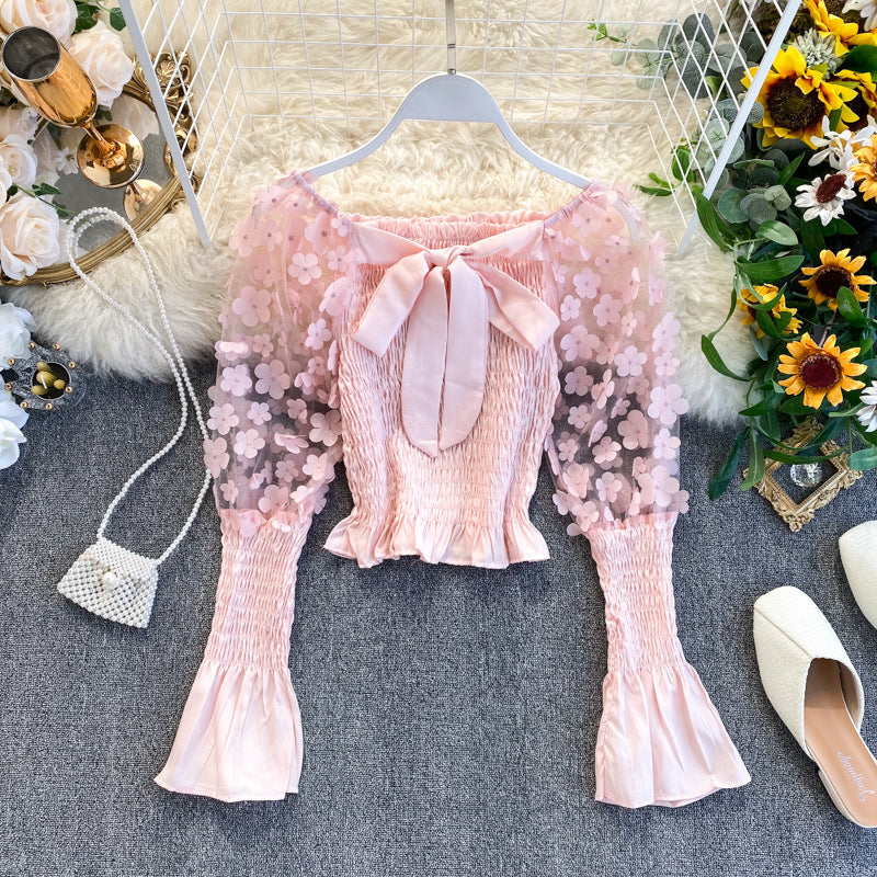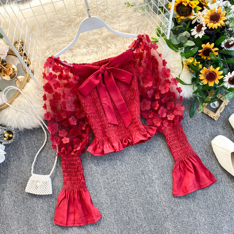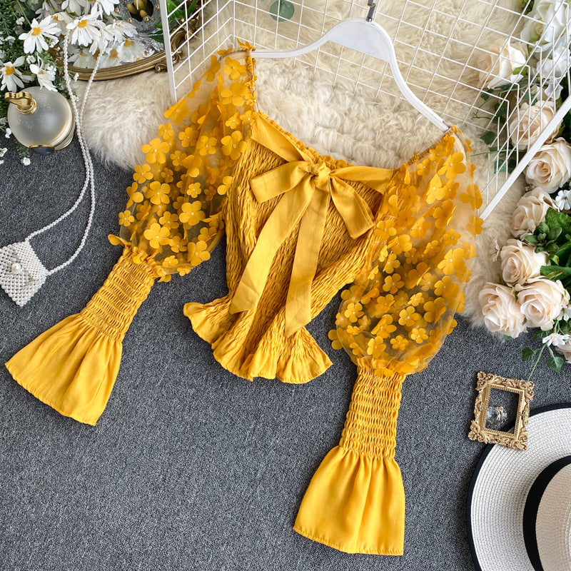 Retro Summer Women Floral Puff Mesh Long Sleeves Ruffled Front Bow Neck Off Shoulder Crop Tops Blouse