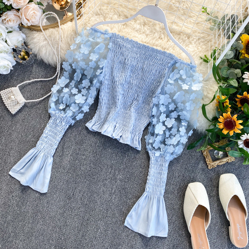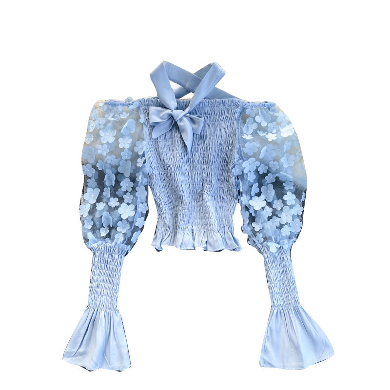 Pattern: Floral, Puff Long Sleeves, Crop Top Blouse