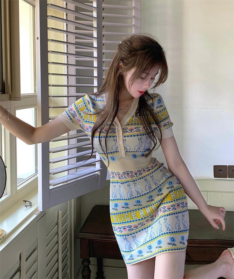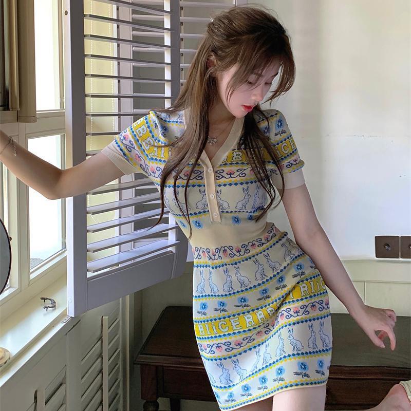 Retro Summer Women Style Jacquard Waist V Neck Short Soft Smooth Knitted Skirt