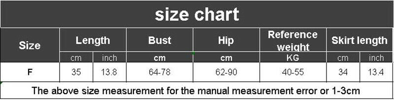 Length: 35 cm/13.8in, Bust: 64-78cm, Hip: 62-90cm, Skirt Length: 34cm/13.4in Reference Weight: 40-55 Kg