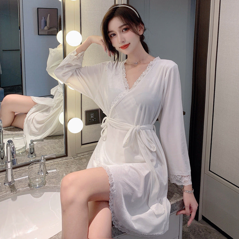 Sexy Women Lace Long Sleeved Velvet Kimono Bathrobe Pajamas Home Nightgown