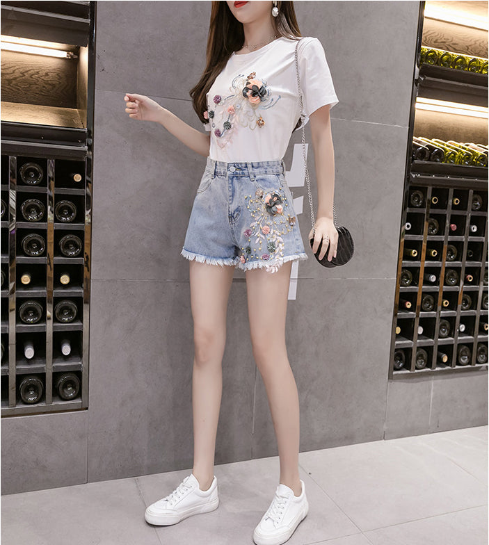 Summer Causal Women Embroidered 3D Floral Beaded High Waist Tassel Lace Hem Jeans Shorts Denim Pants