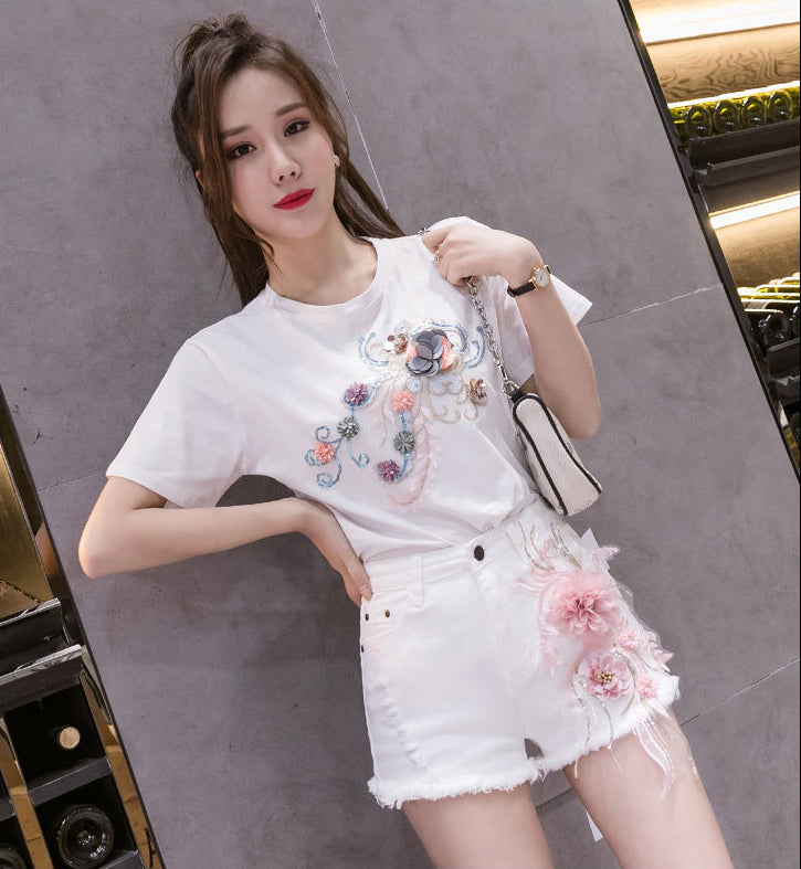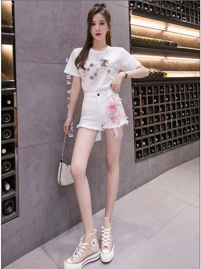 Summer Chic Women Embroidered 3D Pink Floral High Waist Loose Shorts White Denim Pants