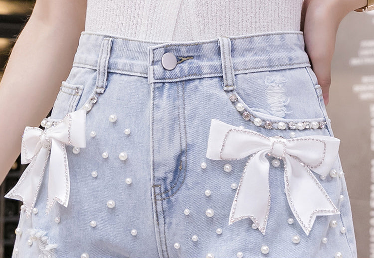 Summer Chic Women Embroidered Beaded Detachable Bow Denim High Waist Loose Shorts Denim Pants