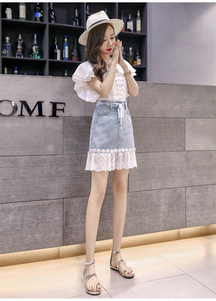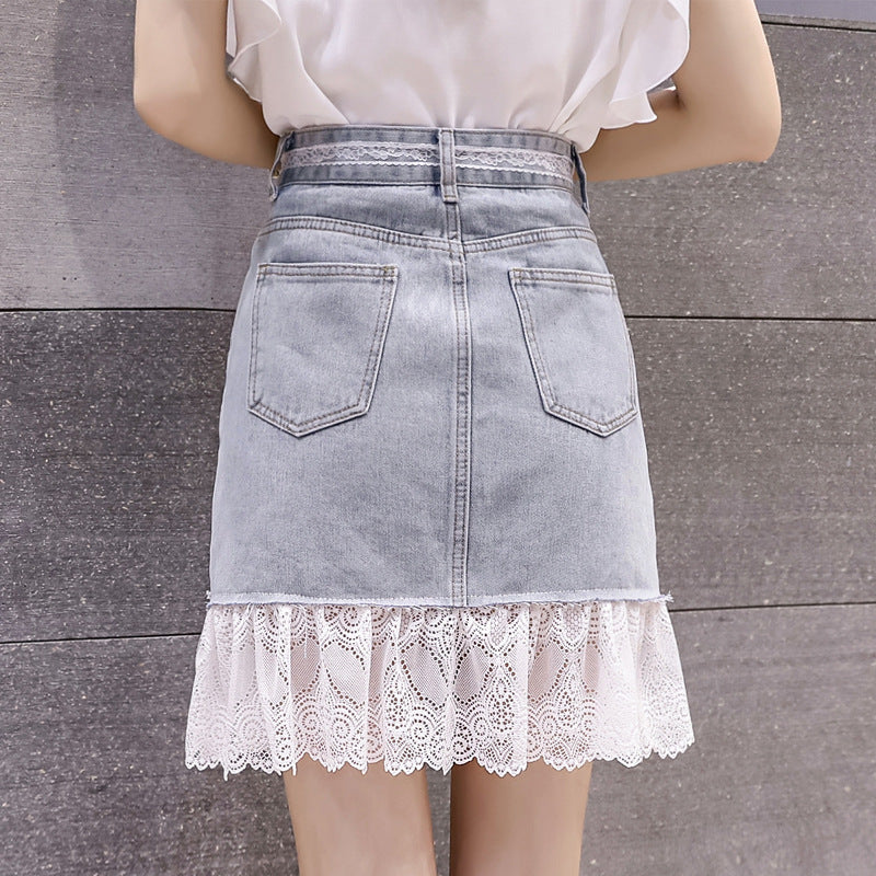 Summer Chic Women Embroidered Floral Lace Belt Mesh Hem Fishtail High Waist Jeans Denim Dress