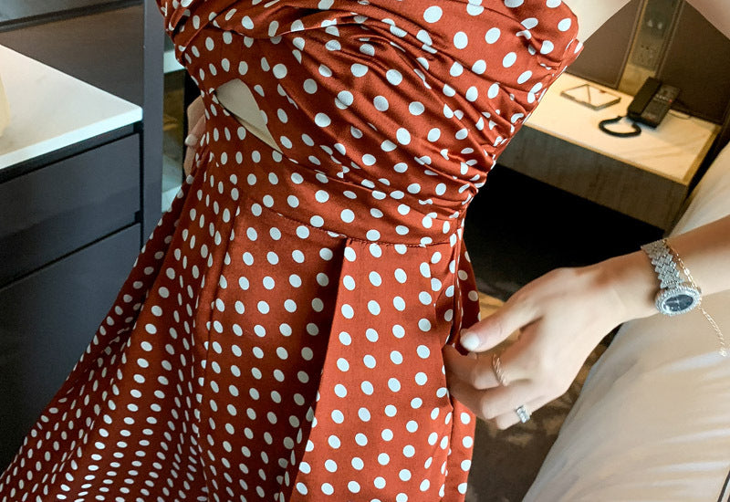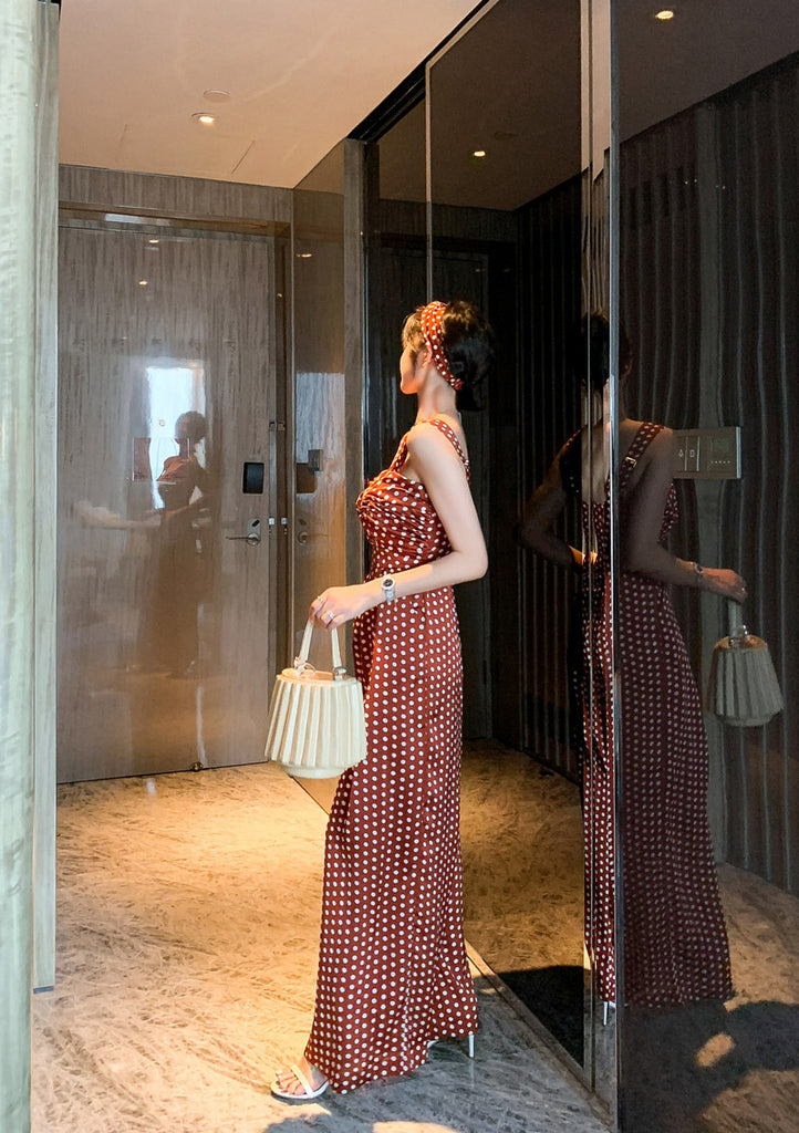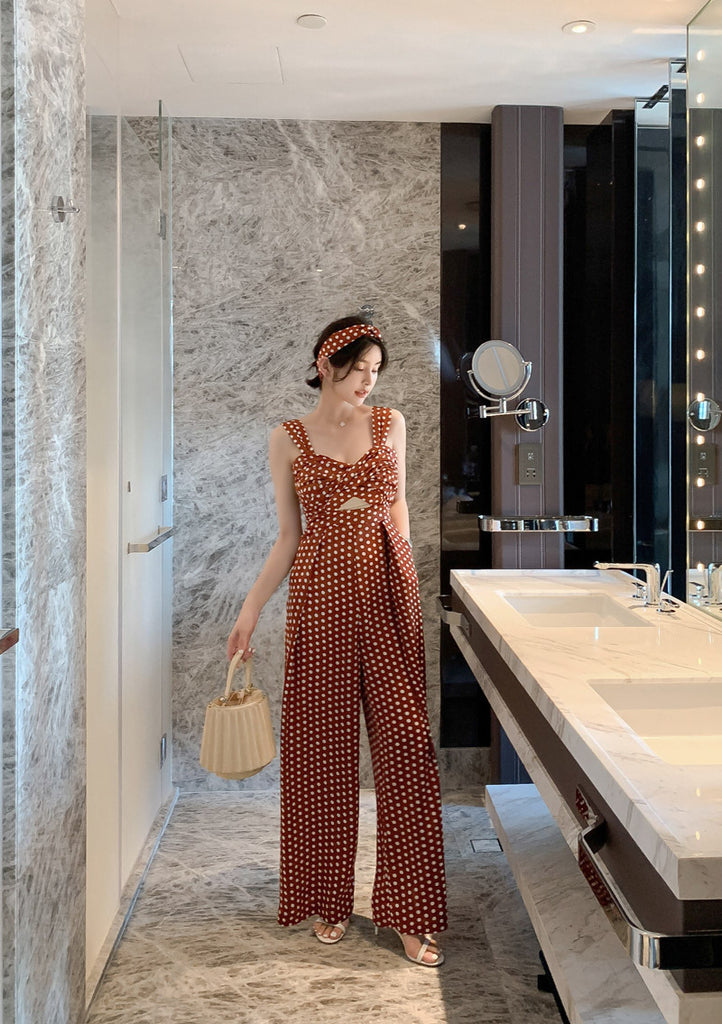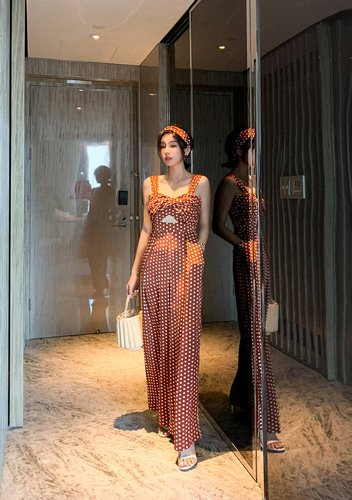 Summer Holiday Women Retro Polka White Dot Brown Shoulder Strap Jumpsuit Wide Leg High Waist Pants