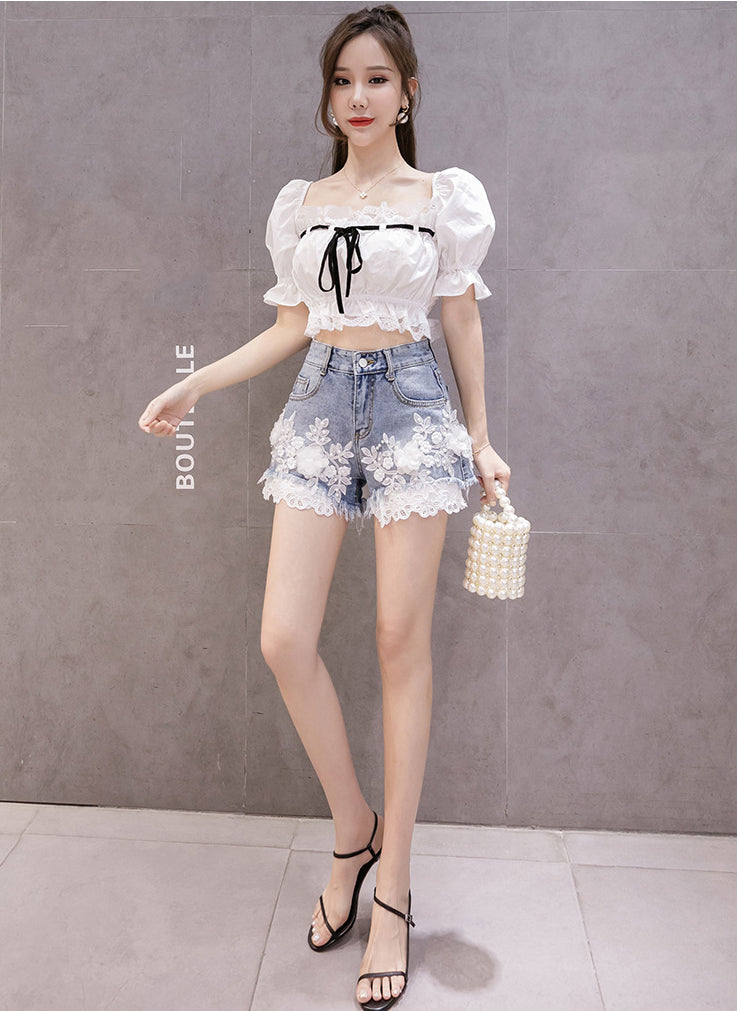Summer Hot Chic Women Embroidered 3D Lace Floral High Waist Loose Shorts Denim Pants