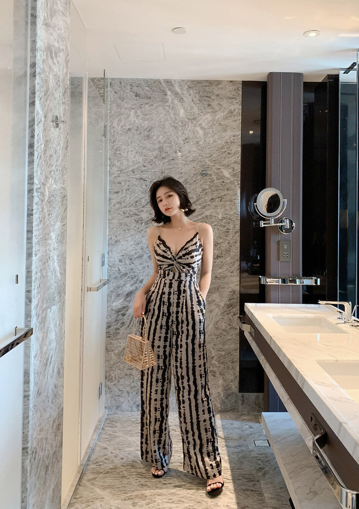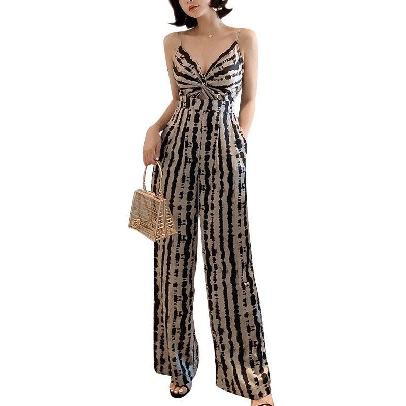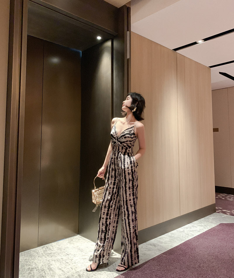 Summer Leopard Wild Women Spaghetti V-Neckline Strap Side Pocket Straight Wide Leg Pants Jumpsuit