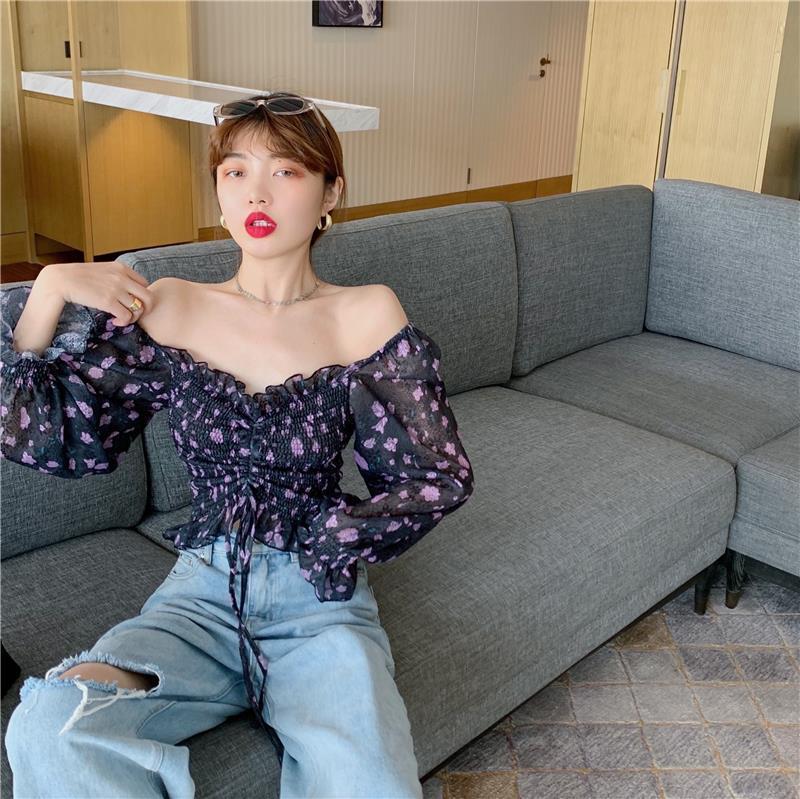 Summer Sexy Women Black Floral Printed Off Shoulder Short Ruffle Sleeve Pleated Waist Drawstring Top Blouse