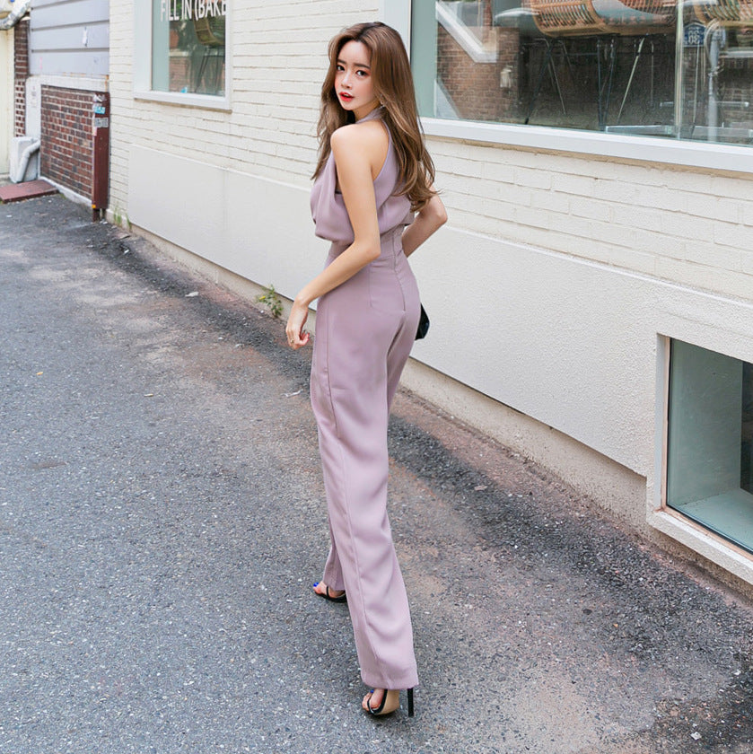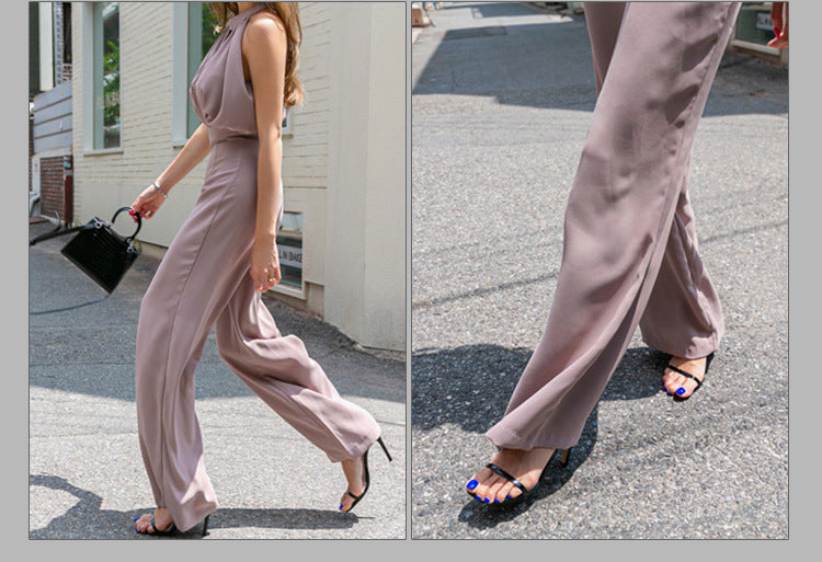 Summer Temperament Ladies Halter Neck Keyhole Sleeveless Hollowed Out Loose High Waist Wide Legs Pants Jumpsuit