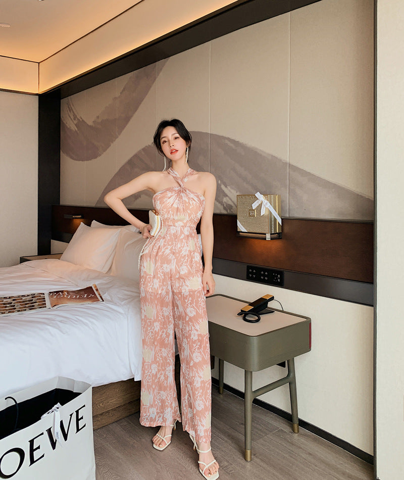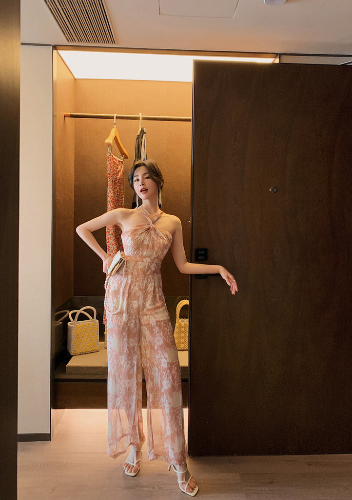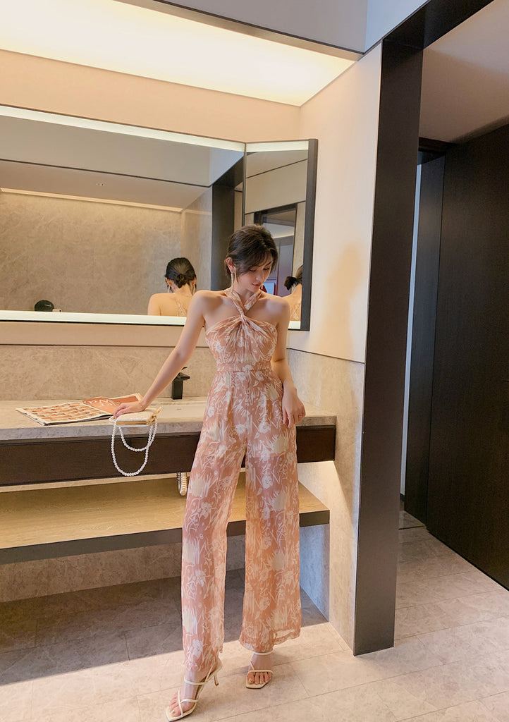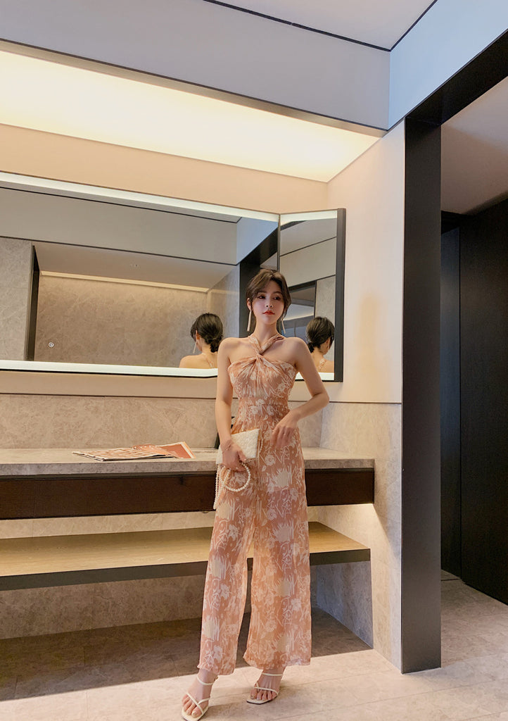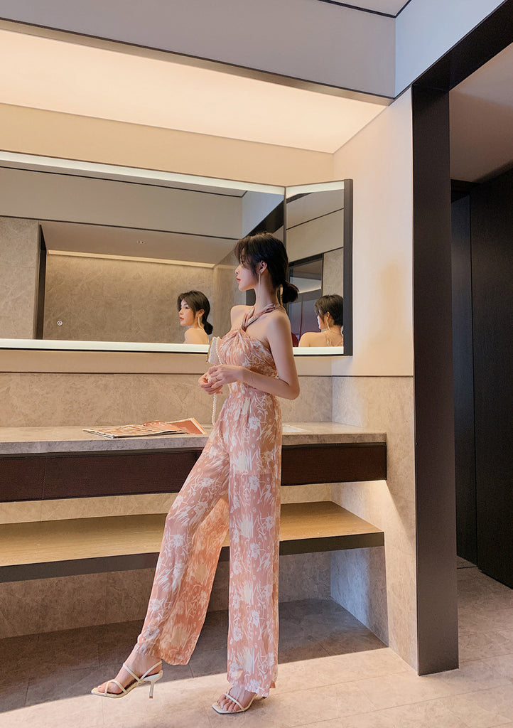 Summer Temperament Women Off Shoulder Halter Neck Pink Chiffon Jumpsuit Loose Wide Leg Trousers