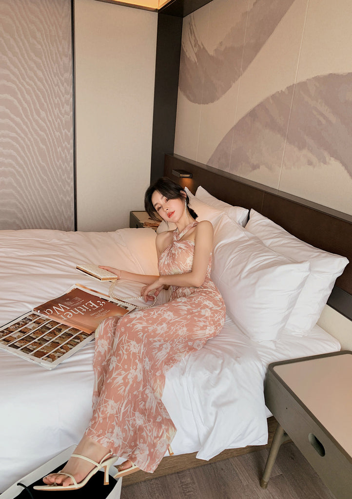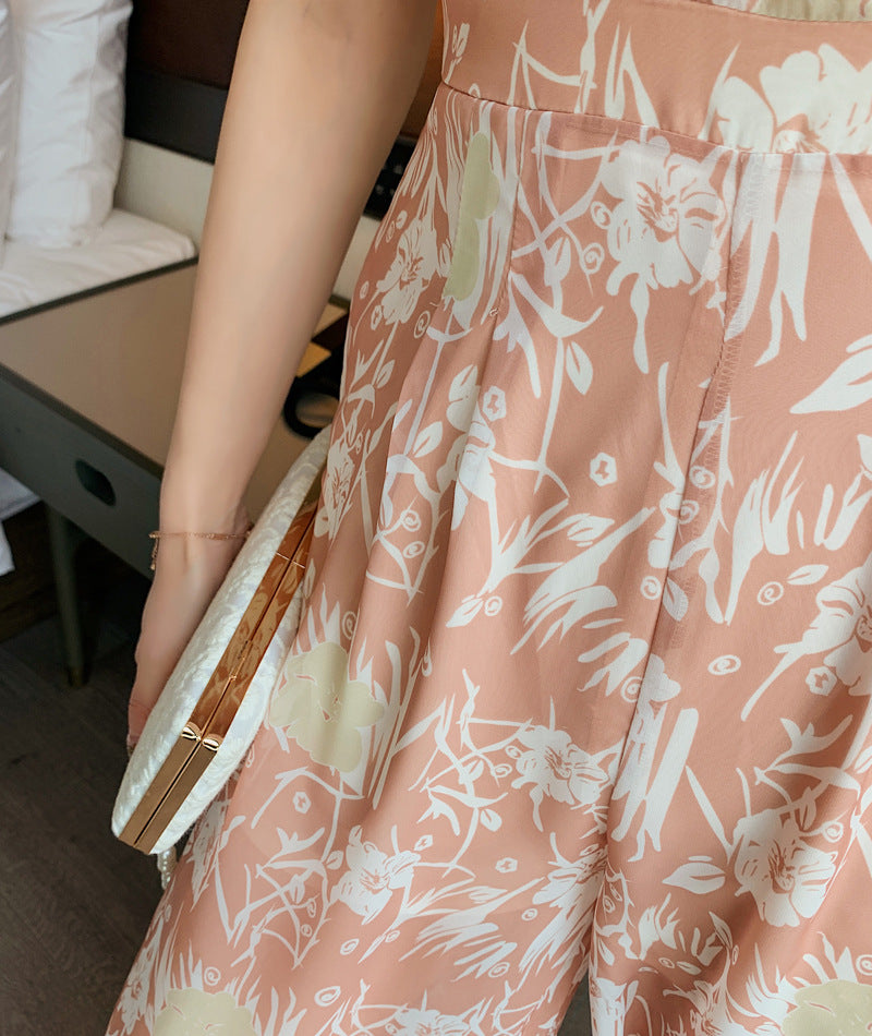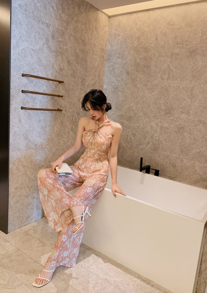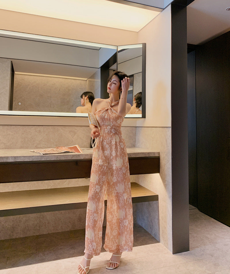 Summer Temperament Women Off Shoulder Halter Neck Pink Chiffon Jumpsuit Loose Wide Leg Trousers