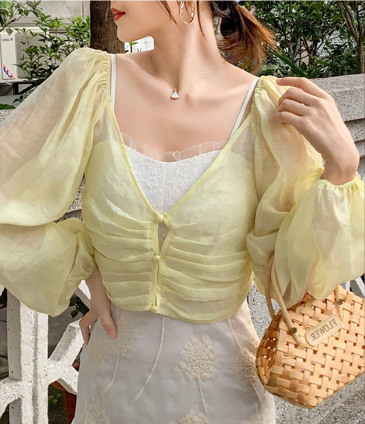 Summer Temperament Women Sun Protection Long Puff Sleeved Shawl Solid Color Top Cropped Outer Wear