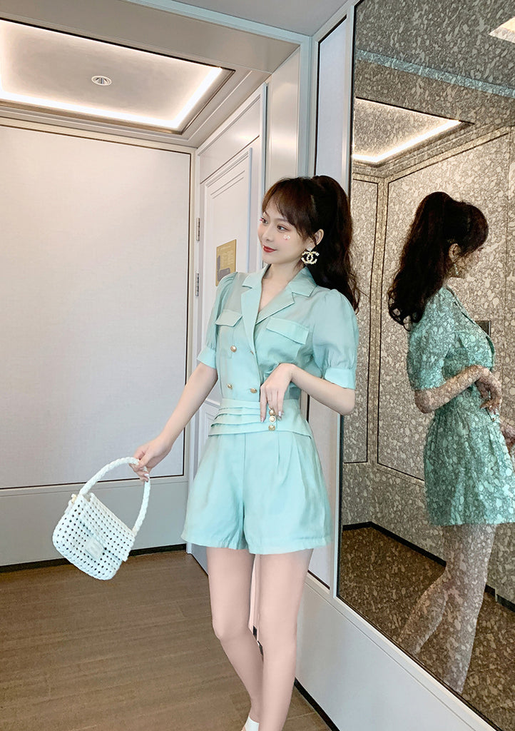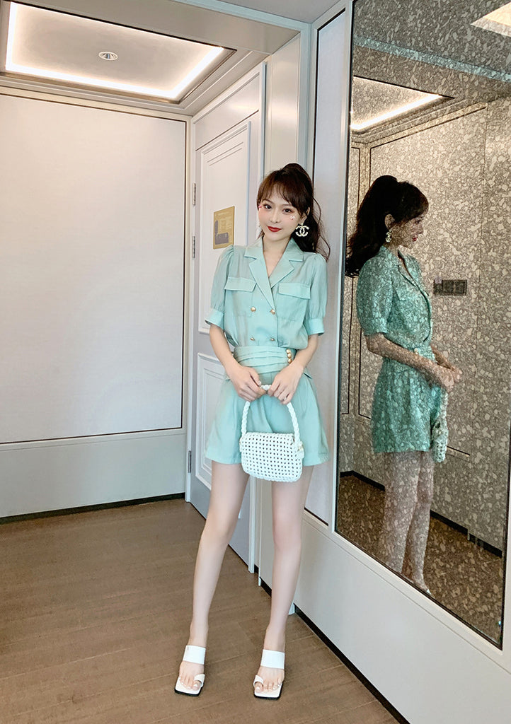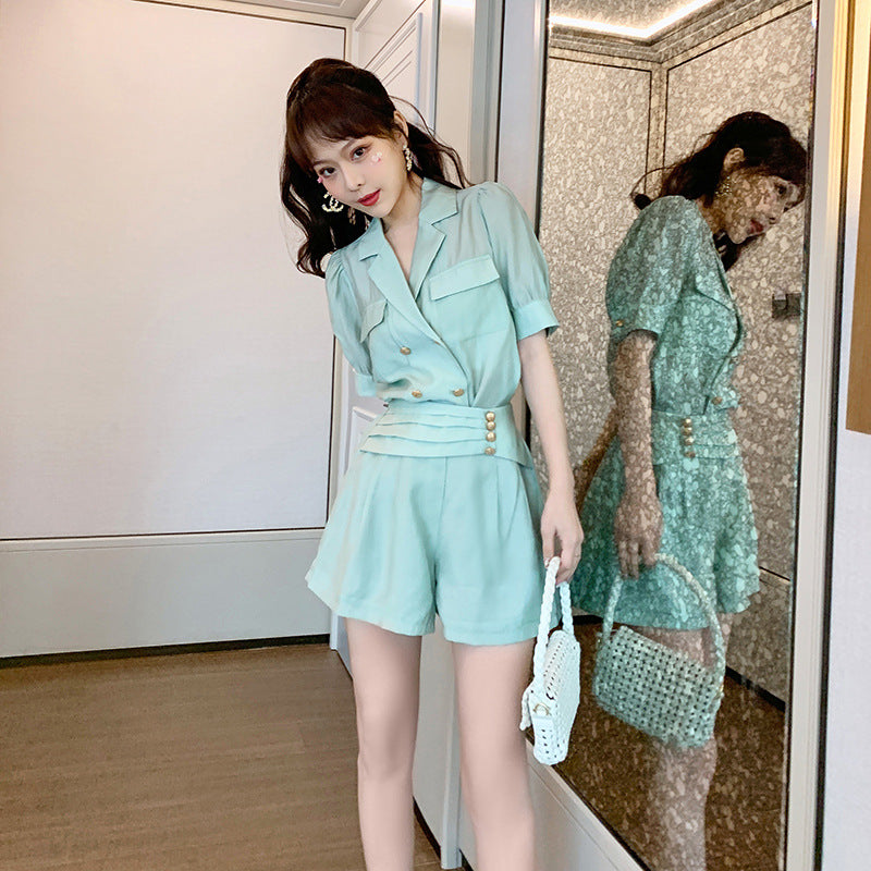 Summer Western Style Young Look Fair V Collar Neck High Waist Green Suit Short Sleeves Wide Leg Shorts