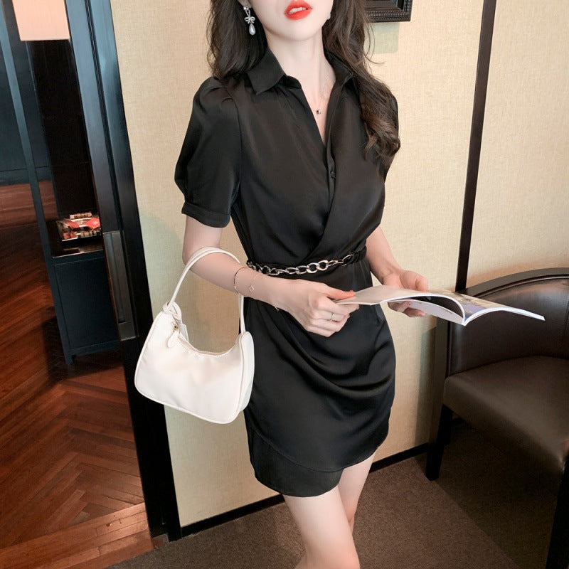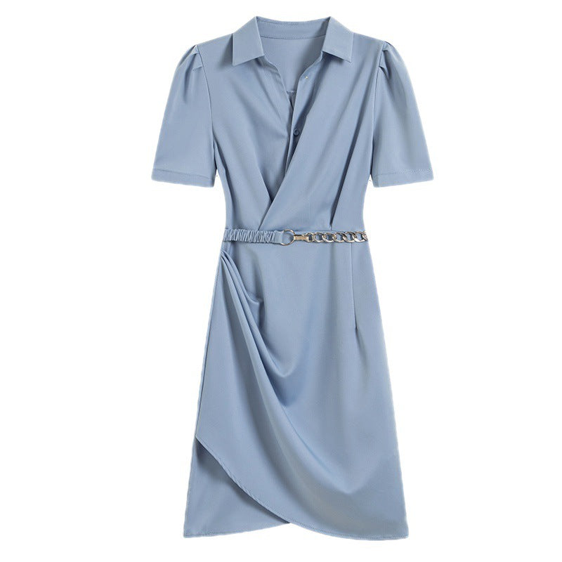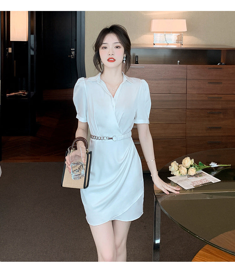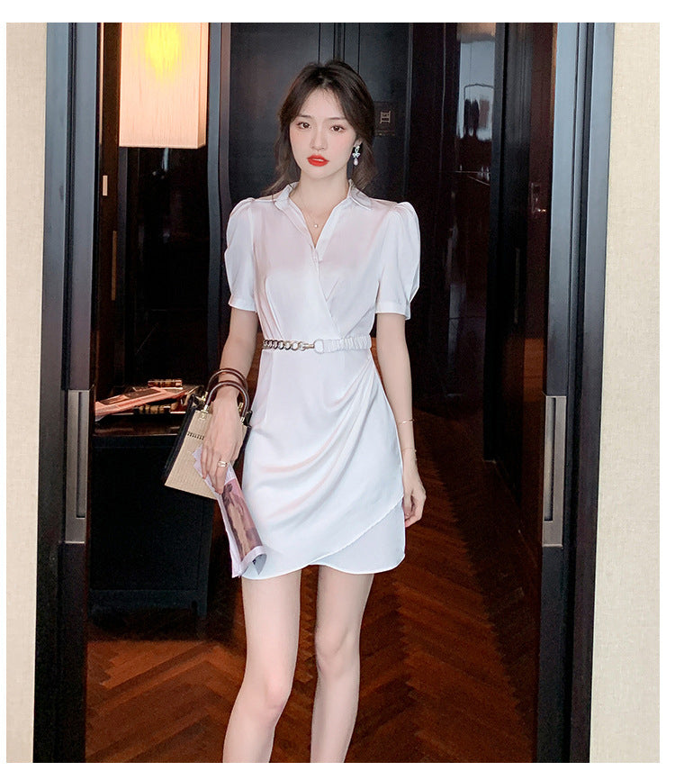 Summer Women Working Office Ladies OL V-neck Solid Color Shirtdress Puff Short Sleeves Belt Design Dress