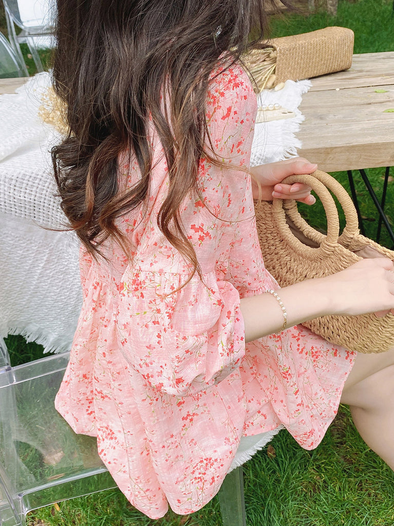 Sweet Fairy Women Pink Color Loose Round Neck Smashed Fluffy Cotton Button Up Front Linen Shirt Top Blouse