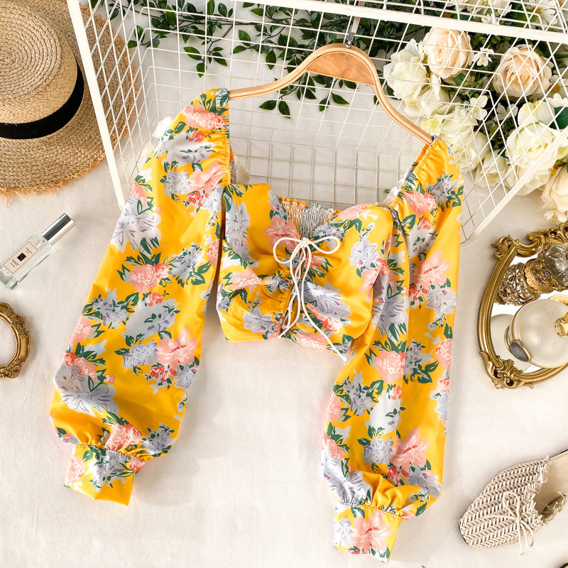 Sweet Women Yellow Square Neck Elastic Floral Printed Puff Long Sleeves Front Drawstring Crop Top Blouse