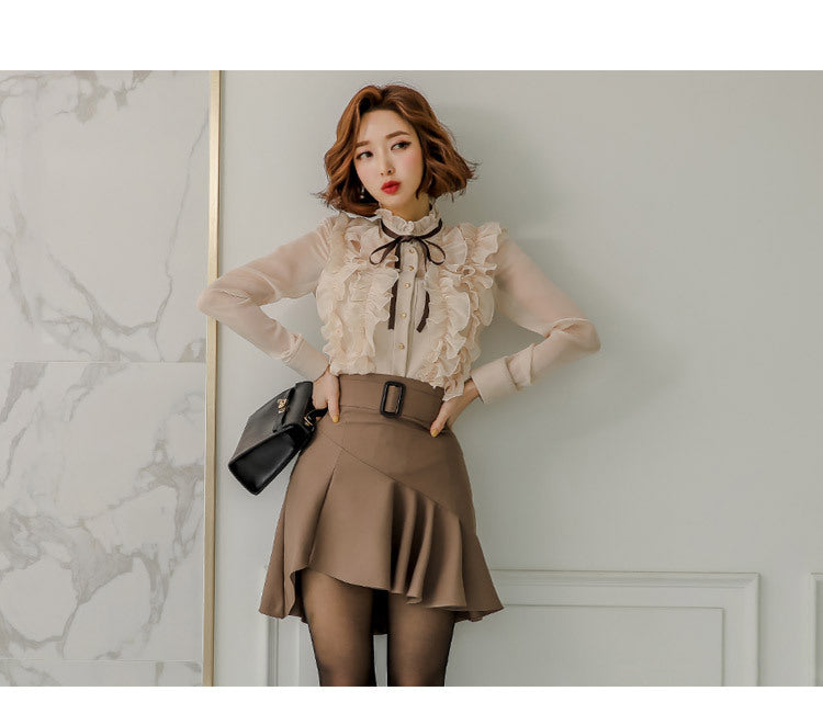 Temperament Stand Collar Lace Shirt Ruffled Shirt Two Piece Set
