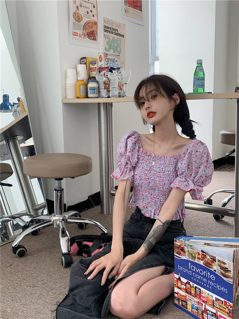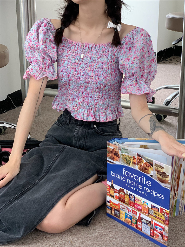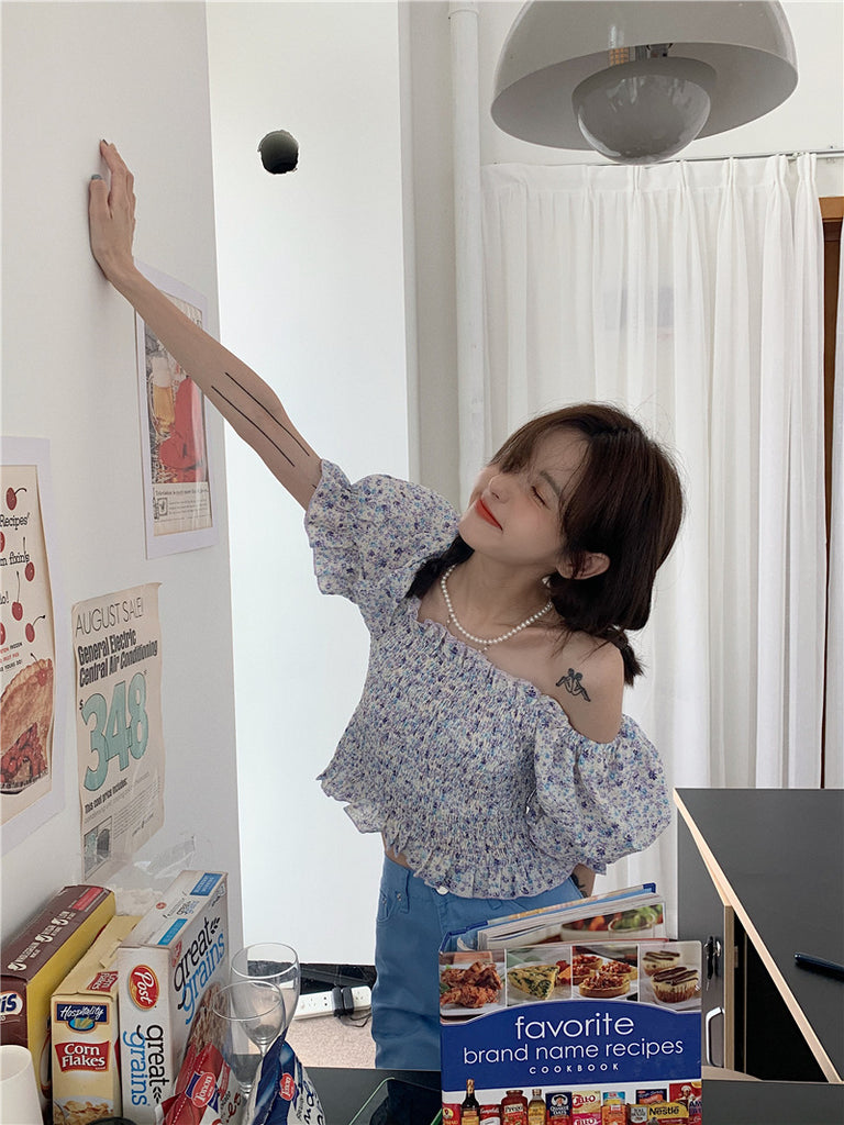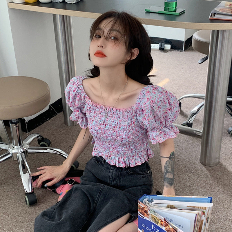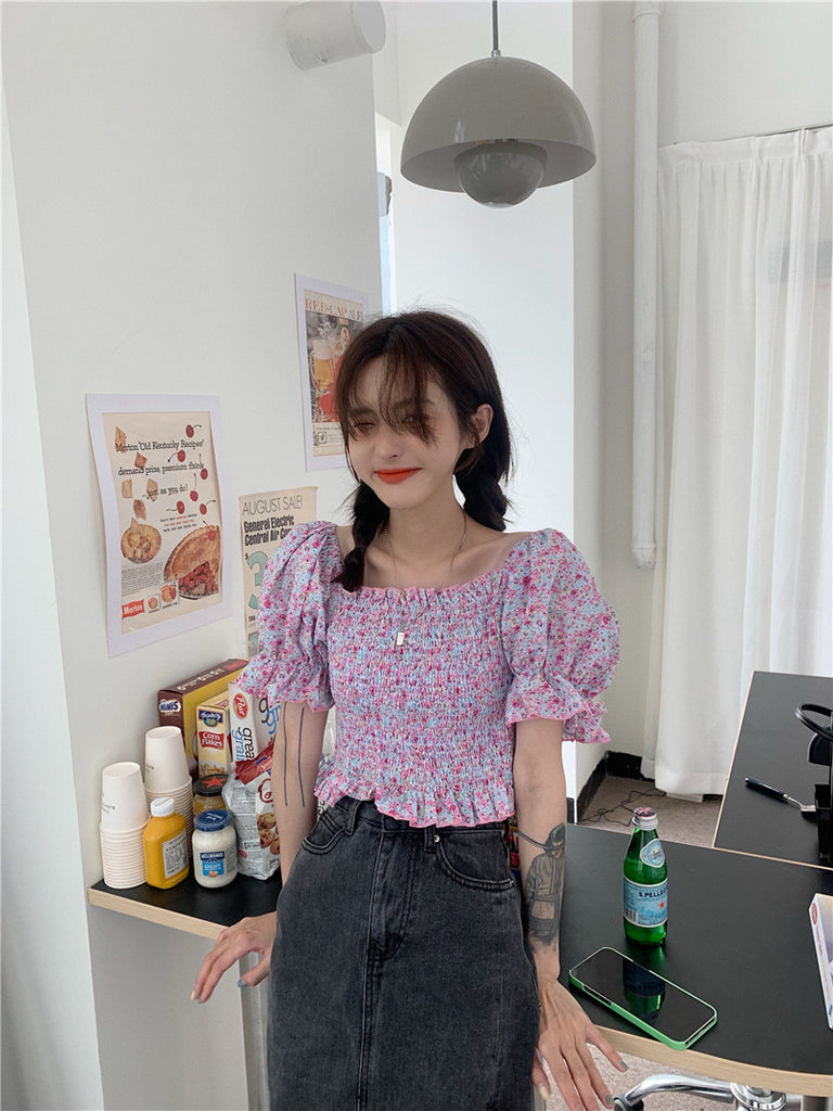 Temperament Sweet Women Smoking Stylish Puff Sleeves Square Neck Smoke Tops Off Shoulder Short Crop Top